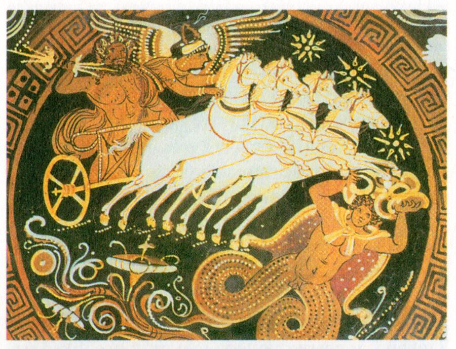 "При виде СВЕРКАЮЩИХ БЛИКОВ И ПРИ УЖАСАЮЩИХ РАСКАТАХ ГРОМА КАЗАЛОСЬ, ЧТО ЗЕМЛЯ И НЕБО СЛИВАЛИСЬ В ГРОМАДНОМ ВИХРЕ: СТОНАЛА ЗЕМЛЯ, ГРОХОТ НАПОЛНЯЛ ВОЗДУХ, ВСЕ ВОКРУГ КОЛЕБАЛОСЬ. Такова была битва богов. Бушевавшие ветры поднимали пыль, ГРОМЫ И МОЛНИИ - ОРУЖИЕ МОГУЩЕСТВЕННОГО ЗЕВСА - И С ГРОХОТОМ И ДИКИМИ ВОПЛЯМИ ОБРУШИВАЛИ ИХ В ГУЩУ СРАЖЕНИЯ. В нескончаемом рокоте кровавого боя все демонстрировали силу своих рук" (Гесиод).