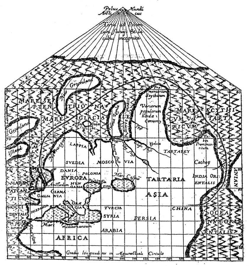 Кстати, на рис.2.11 мы приводим карту Евразии, составленную западными европейцами в 1611 году. То есть в начале СЕМНАДЦАТОГО ВЕКА. Видно, насколько она еще примитивна. Африка составляет с Азией единый материк. Скандинавский полуостров слился с Европой. Более или менее неплохо изображено лишь Средиземноморье. По-видимому, после раскола Великой = "Монгольской" Империи в начале XVII века многие географические сведения были забыты и европейцам пришлось заново восстанавливать географические карты. Стоит отметить, что на данной карте изображена огромная Тартария. Северный Океан назван СКИФСКИМ И ТАРТАРСКИМ.