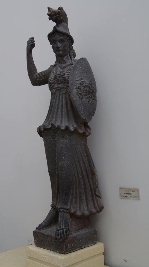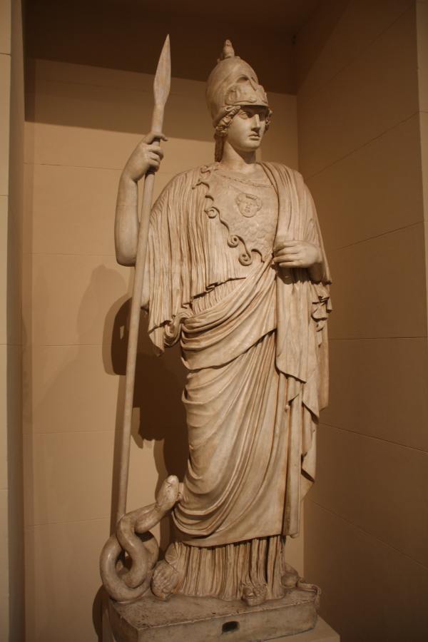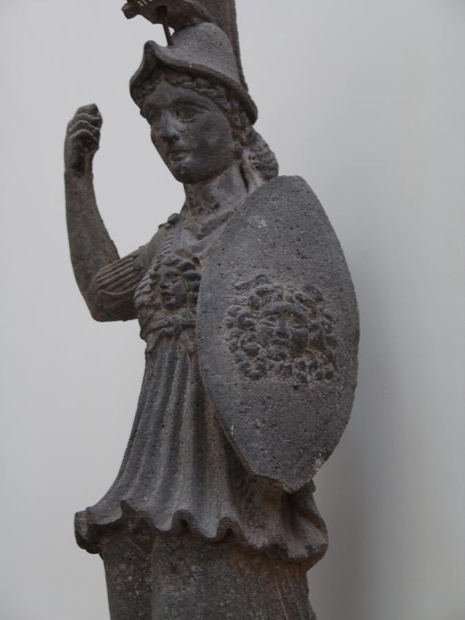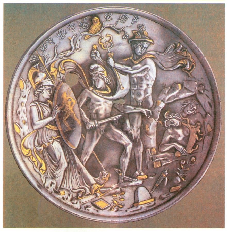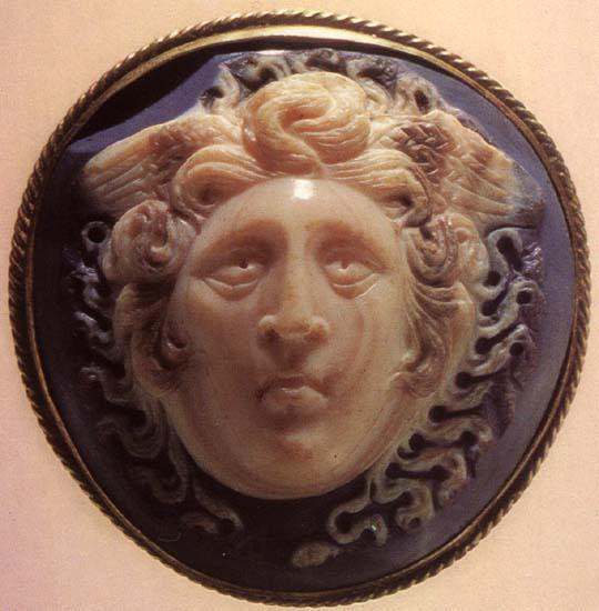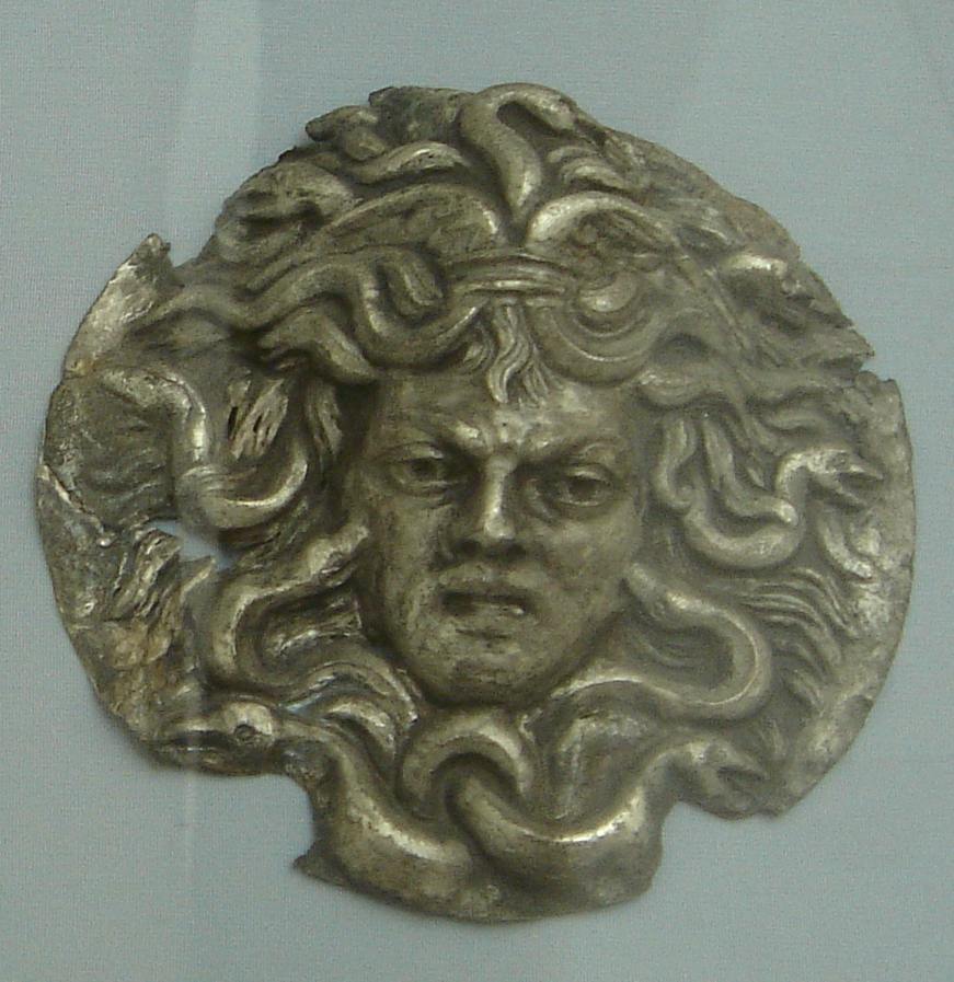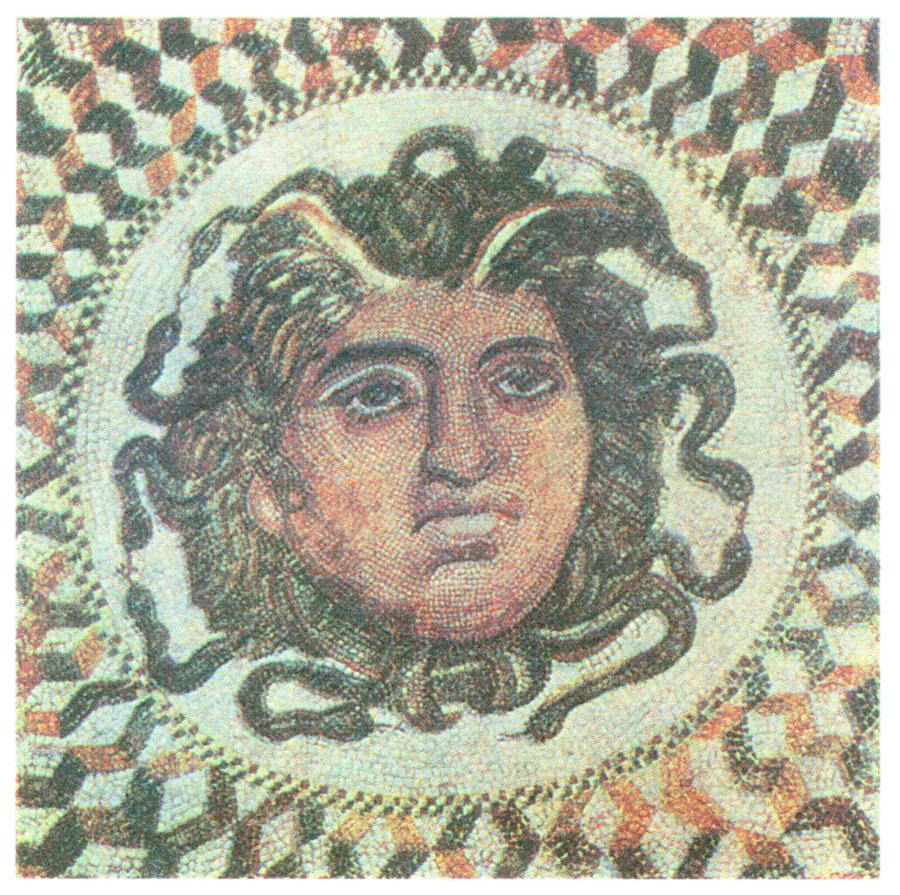 Зевс и олимпийцы побеждают. Крон, Атлант и Титаны разгромлены. По одним сведениям их заключили в Тартар. По другим - изгнали на далекий Запад, на самый западный из Британских островов. Там заключили Атланта, заставив его поддерживать небесный свод. Так возникло название "Атлантика". Бог Персей превратил Атласа-Атланта в каменную гору, показав ему голову Медузы-Горгоны, рис.2.13. Кстати, Атлант - предводитель Титанов - олицетворял, вероятно, хана Мамая = Ивана Вельяминова = Голиафа. Получается, что П-Рус = Персей убил Атланта, превратив его в камень при помощи Медузы-Горгоны. Иными словами, князь Донской = П-Рус или Белый Рус убил хана Мамая = Атланта, разгромил его войска при помощи пушек, одним из символов которых потом и стала Медуза-Горгона. Ее голову, обвитую змеями вместо волос, очень часто изображали на груди Афины, богини войны, рис.2.14, рис.2.15, а также на щите Афины, рис.2.15a. Как мы уже говорили, образ женской головы и волосами-змеями был распространен в Руси-Орде и широко представлен на оберегах, гривнах и т.д. Отсюда потом и возник "античный" образ Медузы-Горгоны.