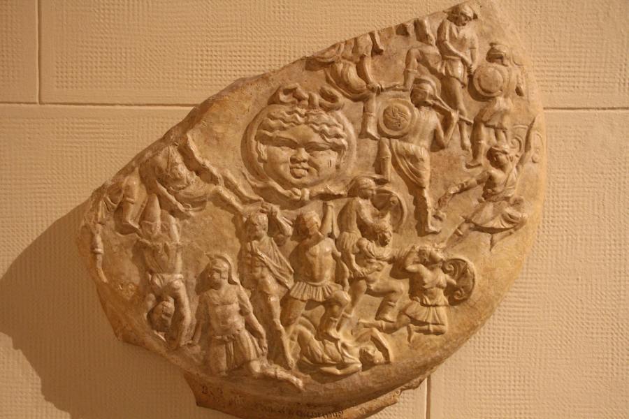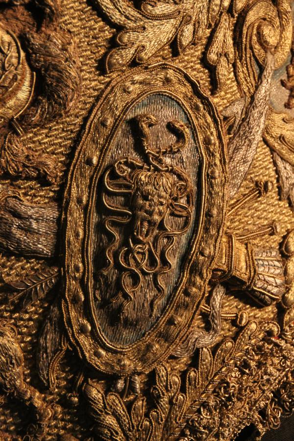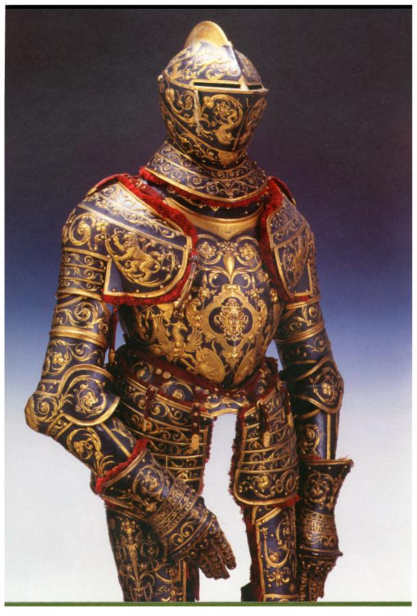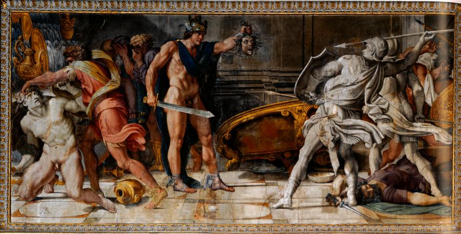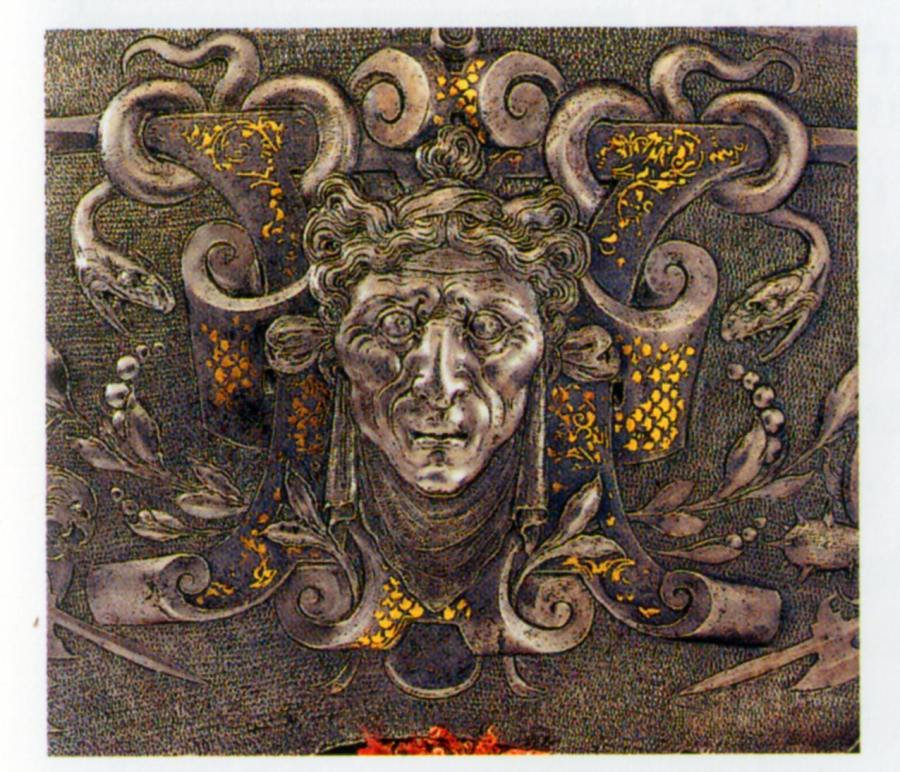 Кстати, становится понятным, почему Персей, убивая Медузу-Горгону и потом, пользуясь ее страшной головой в боях, сам не смотрел ей в глаза, а наблюдал за происходящим в отражающем зеркале. См., например, рис.2.20. Все ясно. По той простой причине, что взглянуть в глаза Медузе означало оказаться прямо перед жерлом огнестрельного орудия в момент выстрела. Делать этого, конечно, не следовало. На рис.2.29 приведена старинная фреска "Персей борется с Финеем". В вытянутой руке Персея мы видим голову Медузы-Горгоны, взгляд которой обращает в камень врагов, рис.2.30. На голове Медузы вместо волос извиваются многочисленные змеи. "Военные" изображения Медузы оставались популярными до XVII-XVIII столетий, после чего постепенно сошли на нет. Все понятно: античность XIV-XVII веков ушла в прошлое и на смену старым символам пришли новые. В Швеции, например, Медузу-Горгону по инерции изображали на роскошных попонах королевских лошадей, рис.2.30a, рис.2.30b, на королевских латах, рис.2.30c (см. на груди), рис.2.30d, вплоть до XVII-XVIII веков, а потом эта традиция угасла.