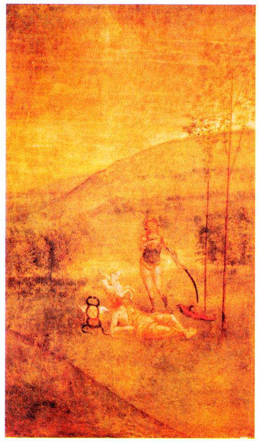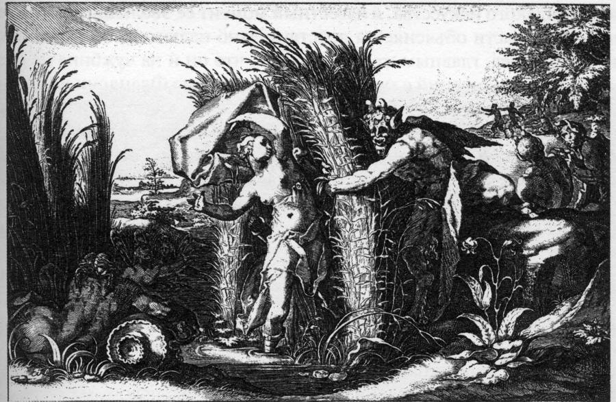 Наконец, говорится, что Титаны обратились в беспорядочное бегство после НЕОЖИДАННОГО КРИКА КОЗЛОНОГОГО БОГА ПАНА, бывшего в войске Зевса. В книге "Крещение Руси", глава 3:12, мы показали, что "античный" бог Пан олицетворял собой ПУШКИ. Теперь становится вполне понятно, почему неожиданный крик Пана так потряс Титанов. НЕОЖИДАННЫЙ ГРОХОТ ОГНЕСТРЕЛЬНЫХ ОРУДИЙ, раздавшийся на Куликовом поле, возвестил начало разгрома войск Мамая = Максенция. После этого "неожиданного крика" уцелевшим мамаевцам не оставалось ничего другого, как кинуться врассыпную. На рис.1.18 мы уже приводили старинное изображение бога Пана конца XVI - начала XVII века. Видно, что художник уже смутно помнил суть дела, а потому изобразил пушку на колесах или ко'злах в виде козлоногого Пана. Еще одно изображение бога Пана см. на рис.2.31.