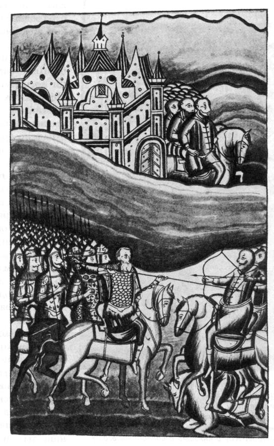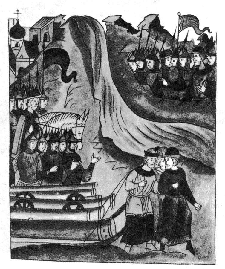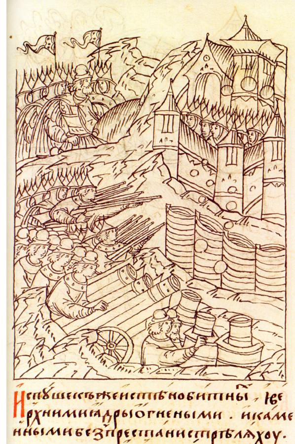 Как и Камбис, Иван Грозный ЛИЧНО возглавил поход на Казань. Между прочим, Казанский поход начался еще в 1547 году, когда "Иоанн решил лично выступить в поход против Казани. Он выехал в декабре 1547 года из Москвы во Владимир и приказал везти туда же пушки. Зима была теплая... когда 2 февраля 1548 года государь выступил из Нижнего, лед на Волге покрылся водой, и много пищалей и пушек провалилось" [578], кн.2, с.389. Перевозка русских орудий по льду показана на старинной миниатюре из Царственного Летописца, рис.5.16.