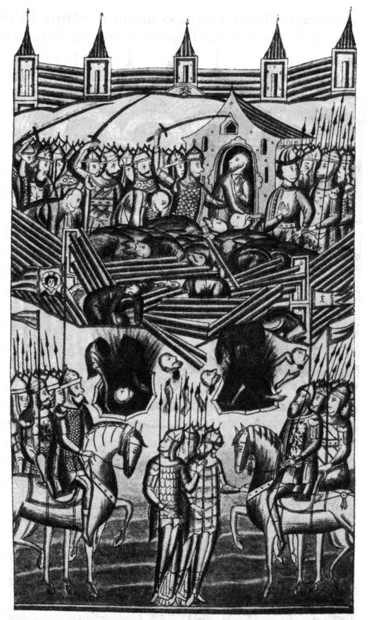 Казанцы в это время взяли себе в цари астраханского царевича Едигера; СУДЬБА ЖЕ БОЯРСКИХ ДЕТЕЙ, ПРИБЫВШИХ В ГОРОД С ОБОЗОМ КНЯЗЯ МИКУЛИНСКОГО, БЫЛА ПЕЧАЛЬНА: "Тех же воеводских юнош, - говорит летописец, - в Казань впустивше, и яша всех, и понудиша их прежде ласканием отрещися веры христьянския и прияти веру басурманскую, яко в чести велицет будут у них... Они же (боярские дети - Авт.) возопиша вси единым гласом купно: "Не даждь Бог отлучитися веры Христовы и попрати святое крещение вас ради нечестивых и поганых человек", после чего БЫЛИ ПРЕДАНЫ ЖЕСТОЧАЙШИМ ПЫТКАМ И КАЗНЕНЫ (рис.5.17 - Авт.).