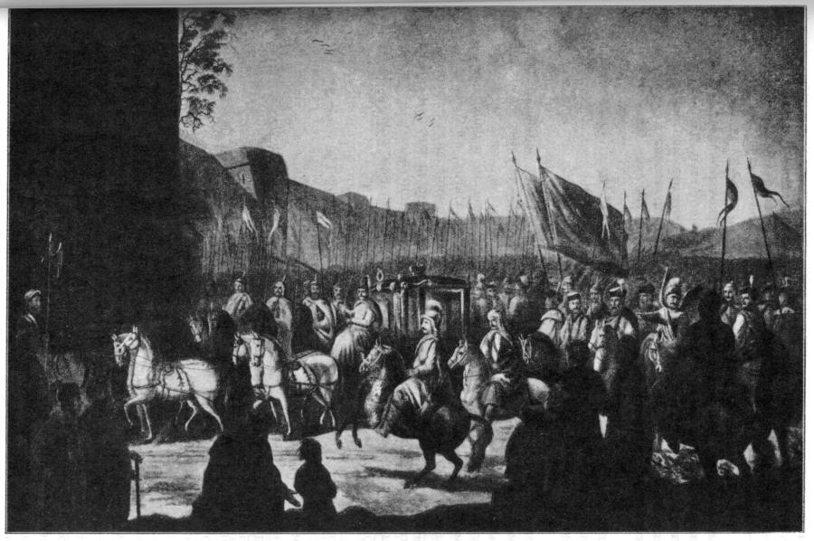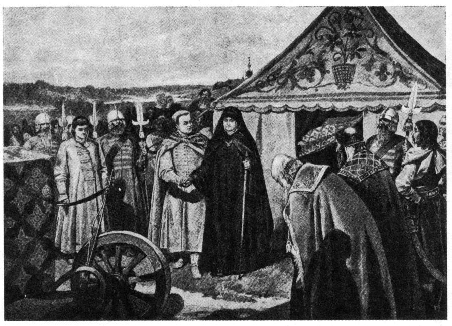 Встреча "Лже"-Дмитрия с инокиней Марфой считалась очень важной. Ее изображали даже на поздних картинах, см., например, рис.6.5.