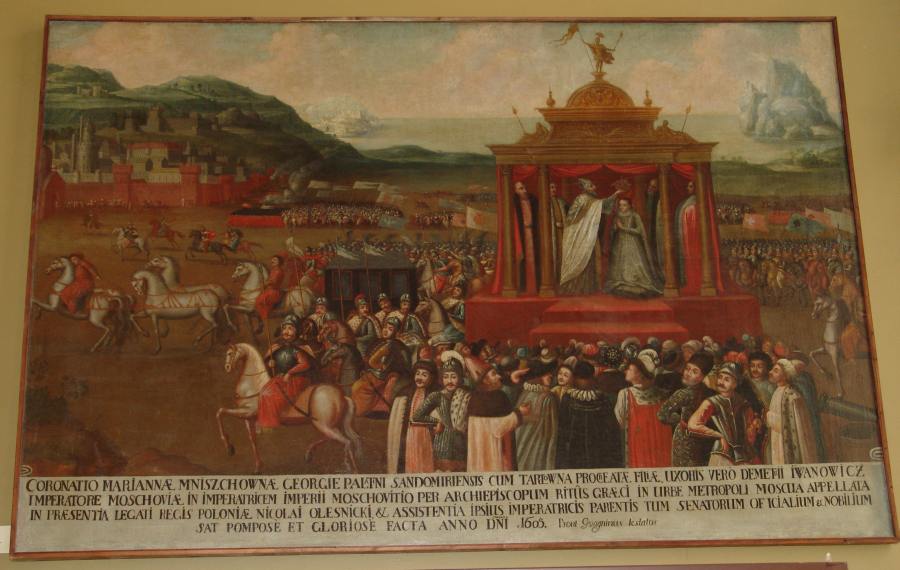 Наряду с инокиней Марфой на сцене здесь появляется и вторая женщина, напрямую связанная с "Лже"-Дмитрием - это известная Марина Мнишек, его жена, рис.6.6, рис.6.6a, рис.6.7. Вскоре, 1 мая 1606 года, полячка Марина Мнишек, как невеста "Лже"-Дмитрия, прибывает в Москву, рис.6.8. Ей была оказана торжественная встреча. "Невеста должна была жить в помещении ИНОКИНИ МАРФЫ, мнимой матери царя, в кремлевском Вознесенском монастыре" [578], кн.2, с.780. Обручение ранее произошло в Кракове, рис.6.9, а свадьба состоялась 8 мая 1606 года. На рис.6.10 показана коронация Марины Мнишек.