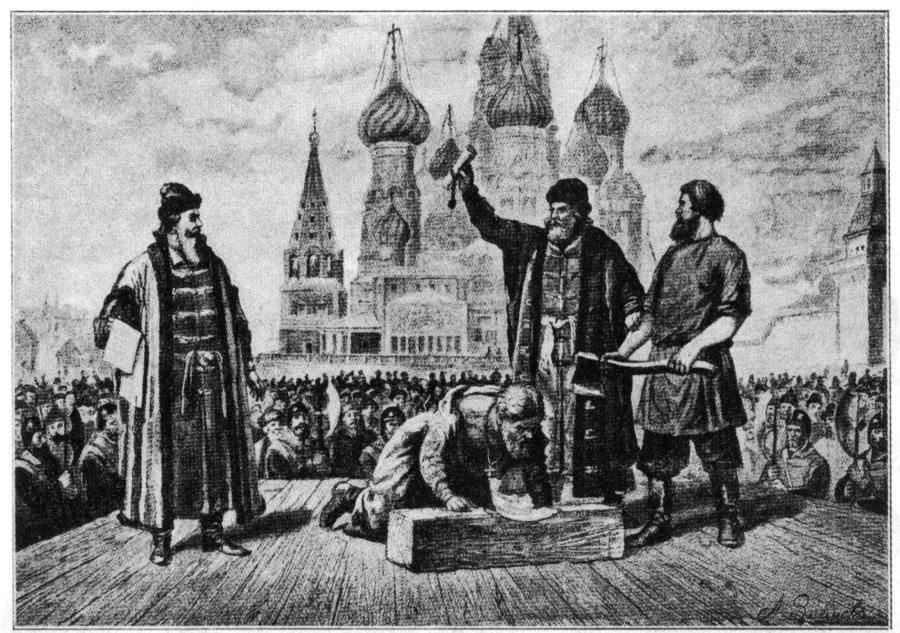 В глубокой тишине народ теснился вокруг Лобнаго места, где стоял осужденный Боярин... подле секиры и плахи, между дружинами воинов, Стрельцов и Козаков; на стенах и башнях Кремлевских также блистало оружие, для устрашения Москвитян, и Петр Басманов, держа бумагу, ЧИТАЛ НАРОДУ от имени Царскаго: "Великий Боярин, Князь Василий Иванович Шуйский, изменил мне, законному Государю Вашему, Димитрию Иоанновичу всея России; коварствовал, злословил... НАЗЫВАЛ ЛЖЕЦАРЕМ; хотел свергнуть с престола. Для этого осужден на казнь: да умрет за измену и вероломство!" ... Несчастный князь Василий, уже обнажаемый палачом, громко воскликнул к зрителям: "братья! умираю за истину"...