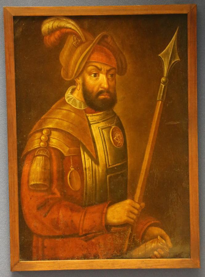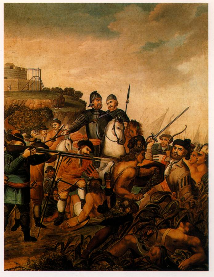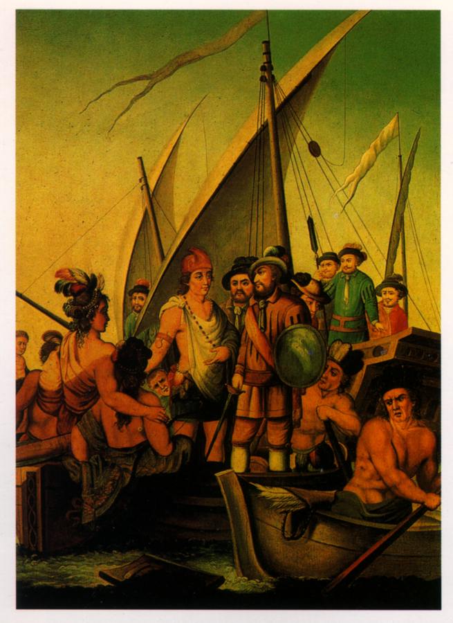 Великий завоеватель, во главе небольшого отряда, плывшего на кораблях и вооруженного огнестрельным оружием, покорил далекую огромную страну, обитатели которой были храбрыми воинами. Неизвестные ранее местным жителям пушки и мушкеты сломили их сопротивление.