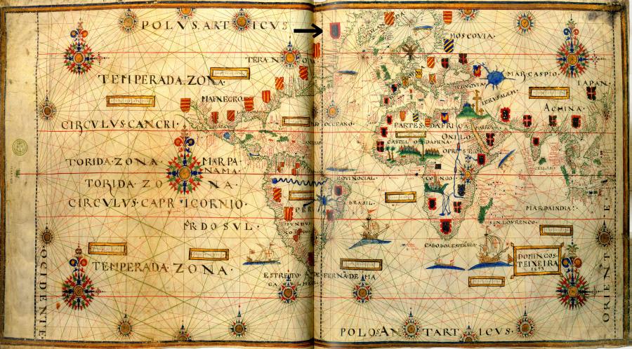 На рис.8.8 мы приводим старинную карту РАЗДЕЛА МИРА между "Кастилией" = Русью-Ордой и "Португалией" = Османией-Атаманией. Комментаторы описывают ее следующим образом: <<Разделение "островов и земель, уже открытых, или тех, которые будут открыты в Море-Океане" между Испанией и Португалией согласно Тордесильясскому договору 1494 года, основанном на буллах римских пап; линия раздела проведена с севера на юг (указана стрелкой), права на земли к западу от нее получила Испания, а к востоку от нее - Португалия (с планисферы Домингуша Тейшейры, XVI век)>> [64:3], с.264.