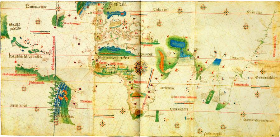 Эта же линия "раздела мира" отмечена и на старинной португальской карте, представленной на рис.8.8a. См. жирную черную вертикальную линию на западной части карты. Вдоль нее идет поясняющая красная надпись.