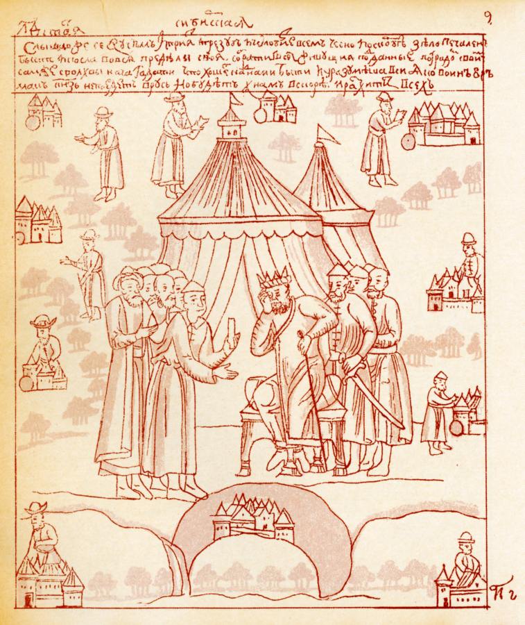 На рис.8.53 приведен рисунок из Кунгурской летописи, наглядно показывающий демонстрацию Ермаком огнестрельного оружия. На троне сидит Ермак. Перед ним - посланец Кугутай. Еще левее - казаки, стреляющие из пищалей. На рис.8.54 показан отъезд Кугутая к своему хану. Кугутай всем рассказывает, что пришедшие казаки "стреляют невидимыми стрелами" [730:1], с.52.