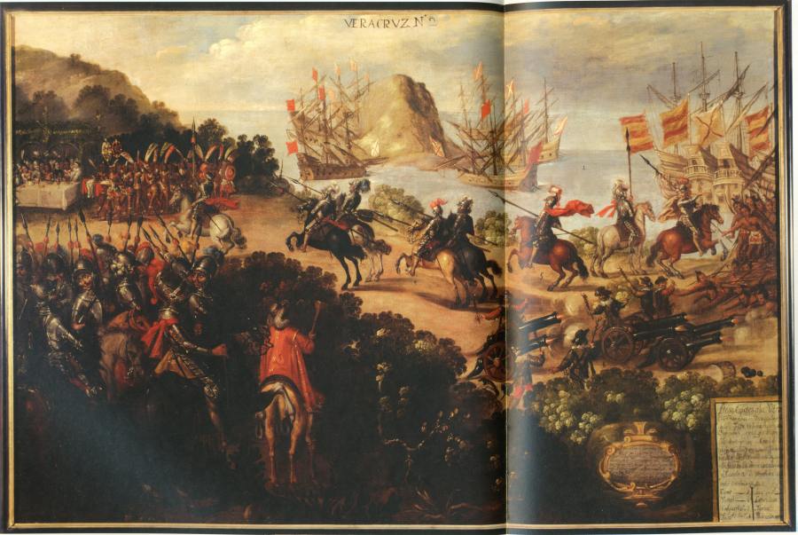 Этот сюжет - запугивание индейцев орудийным огнем - изображался даже на поздних западноевропейских картинах, см., например, рис.8.58. Название этой картины якобы XVII века: "Прибытие Эрнана Кортеса и его войск в город Veracruz".