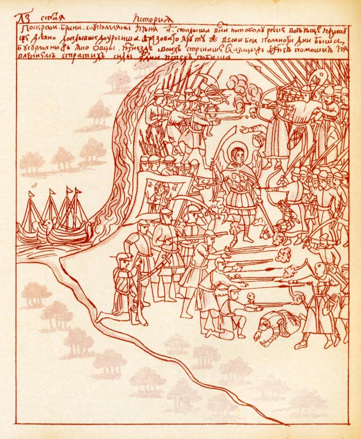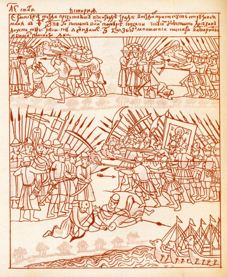Здесь уместно показать вооружение, бывшее у казаков-конкистадоров Ермака-Кортеса. На рис.8.60 и рис.8.61 мы видим два сражения казаков Ермака с воинами хана Кучума, взятые нами из Кунгурской летописи. Хорошо видна разница в вооружении. В руках казаков - стреляющие мушкеты. У остяков-кучумовцев - только луки, копья, стрелы. Арбалетов у них тоже нет. Над войском Ермака развевается знамя с ликом Иисуса Христа.