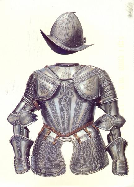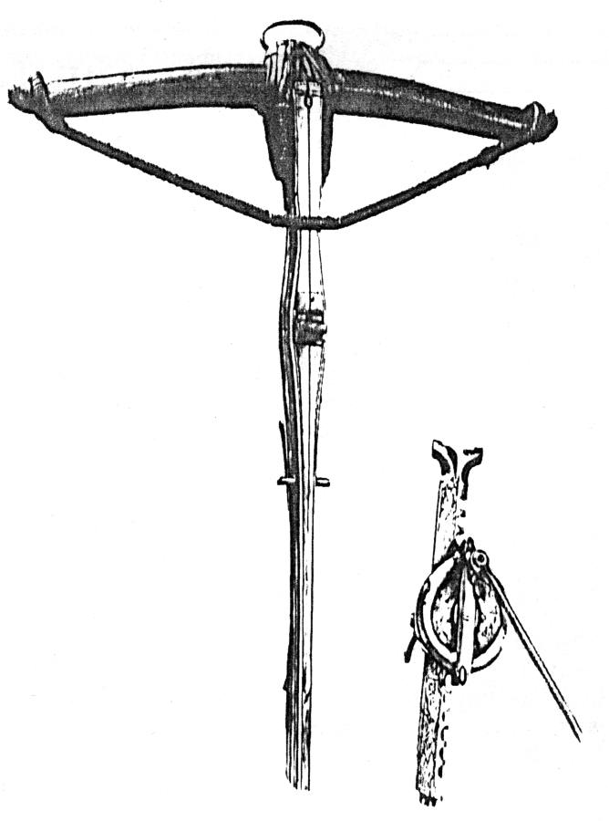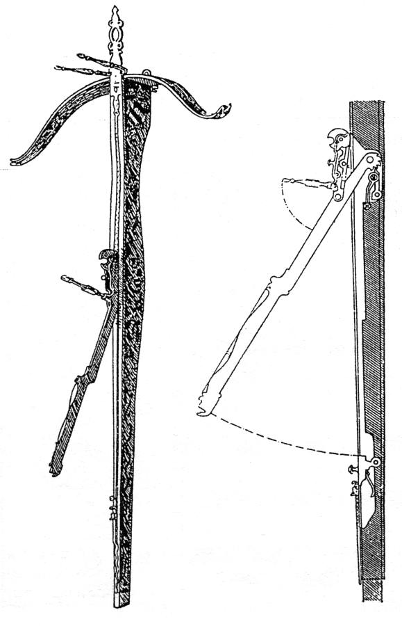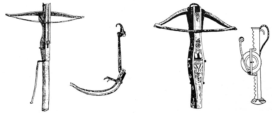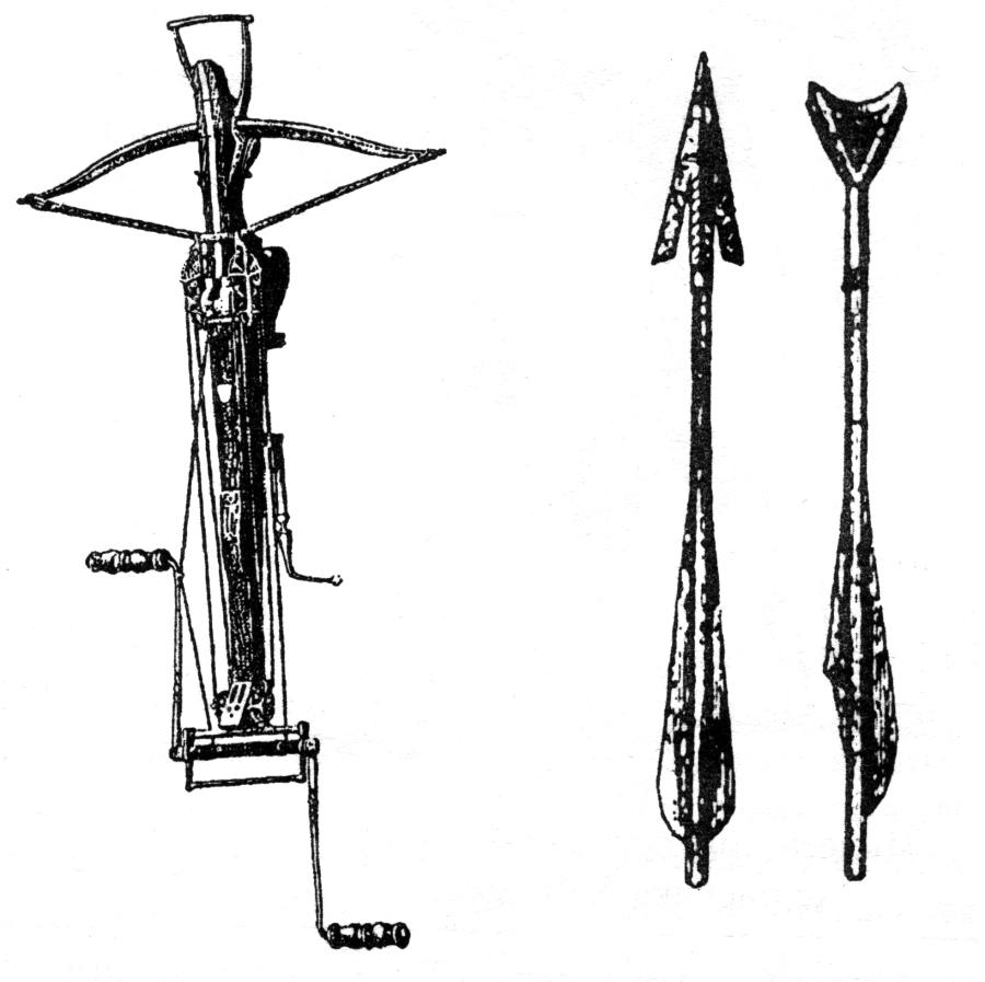 Обратимся теперь к истории конкисты. На рис.8.62 показан гибкий испанский = османский доспех, типичный для пехотинцев-конкистадоров. На рис.8.62a показан портрет казака. На рис.8.63 представлен испанский = османский полудоспех, шлем морион и щит. На рис.8.64, рис.8.65, рис.8.66, рис.8.67, рис.8.68, рис.8.69 и рис.8.70 показаны боевые арбалеты конкистадоров, то есть ордынских казаков и османов-атаманов. Арбалет - мощное оружие, долго находившееся на вооружении специальных подразделений вплоть до XX века. Дело в том, что арбалет позволяет метать, причем достаточно бесшумно, не только обычные стрелы, но и остро наточенные широкие лезвия, ножи, прикрепленные на конце древка-стрелы. Это очень эффективное оружие.