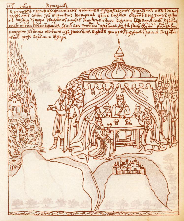 На рис.8.55 Кугутай уже предстает перед Кучумом. Вновь говорится о "невидимом стрелянии казаков". Хан Кучум и его придворные сильно напуганы, рис.8.56. Кучум призывает к себе представителей своих земель и думает - что делать.