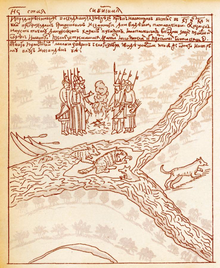 "Опустошив Улусы и селения вниз по Туре, Атаманы в устье Тавды взяли в плен Кучюмова советника, Таузака, который искренностью спасая жизнь, сообщил им все нужные для них сведения о земле своей, и будучи за это освобожден, известил ея Царя, что ПРЕДСКАЗАНИЕ СИБИРСКИХ ВОЛХВОВ СБЫВАЕТСЯ: ибо сии кудесники уже давно, как пишут, вопили на стогнах о неминуемом падении его Державы от нашествия Христиан. Таузак описывал Козаков людьми чудесными, воинами неодолимыми, СТРЕЛЯЮЩИМИ ОГНЕМ И ГРОМОМ СМЕРТОНОСНЫМ НА-ВЫЛЕТ СКВОЗЬ ЛАТЫ...