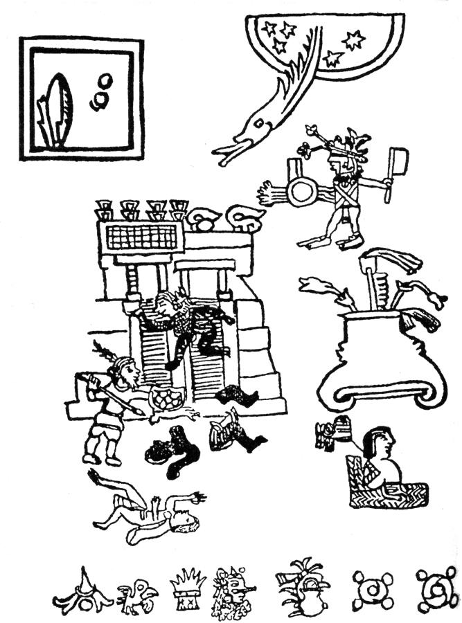 (На приводимом нами рис.8.86 - Авт.) слева - изображено самое зловещее из всех знамений - птица, принесенная несколькими охотниками, в голове ее находилось зеркало, в котором отражалось небо со звездами, а когда Мотекусома II заглянул в него вторично, то увидел отряды вооруженных людей, он позвал прорицателей... но птица улетела; справа изображена ритуальная игра в мяч... Мотекусомы II с Несауальпилли, как-то заспоривших, чьи прорицатели лучше, ибо тескокские прорицатели Несауальпилли говорили, что страной мешиков будут правит чужеземцы... Эта игра должна была решить спор. Мотекусома II выиграл первые две, но проиграл следующие три подряд... Его прорицатели оказались плохи>> [64:3], с.62.