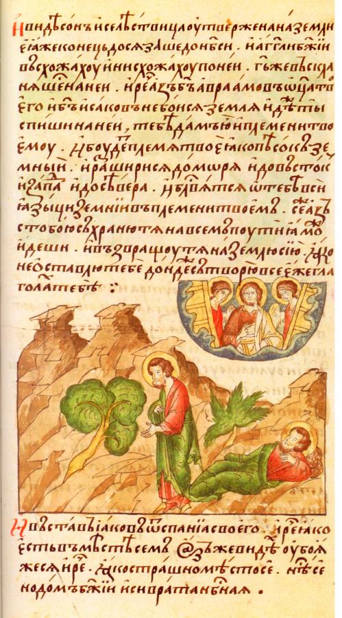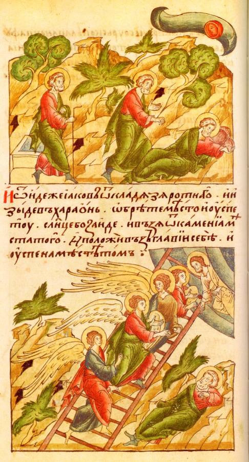 <<И отиде же Иаков от Кладязя ротнаго, и изыде в ХАРАОН. Обрете место и успе ту, СОЛНЦЕ БО ЗАИДЕ. И ВЪЗЯ ОТ КАМЕНИА МЕСТА ТОГО, И ПОЛОЖИ ВЪЗГЛАВИИ СЕБЕ, И УСПЕ НА МЕСТЕ ТОМ. И ВИДЕ СОН. И СЕ, ЛЕСТВИЦА УТВЕРЖДЕНА НА ЗЕМЛИ, ЕЯ ЖЕ КОНЕЦ ДОСЯЗАШЕ ДО НЕБЕСИ. И аггели Божии въсхожаху и нисхожаху по ней, ГОСПОДЬ ЖЕ ВСКЛАНЯШЕСЯ НА НЕЙ. И рече...