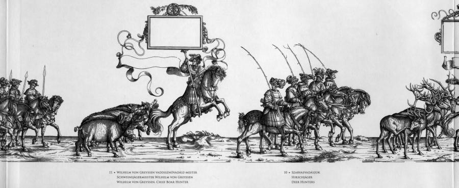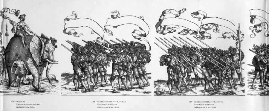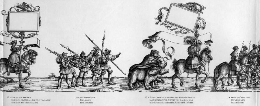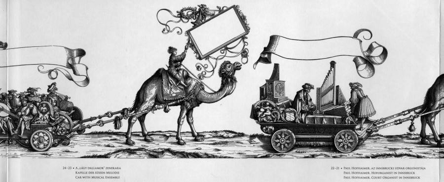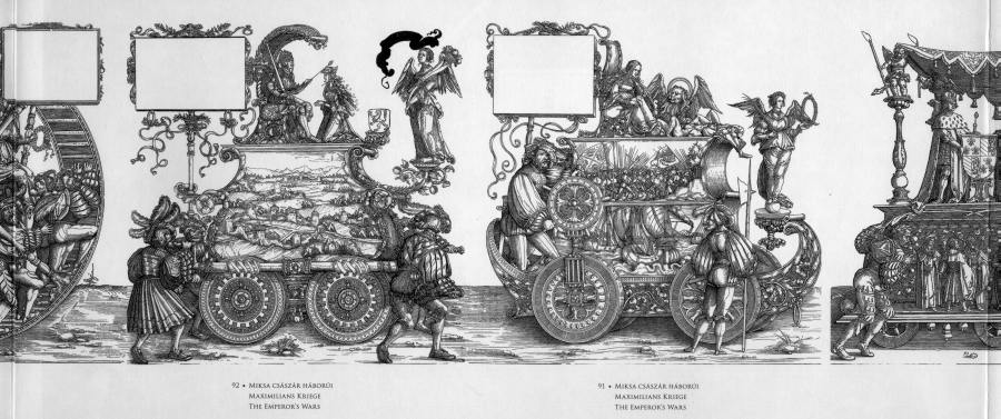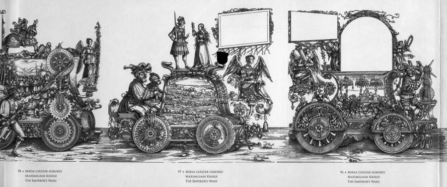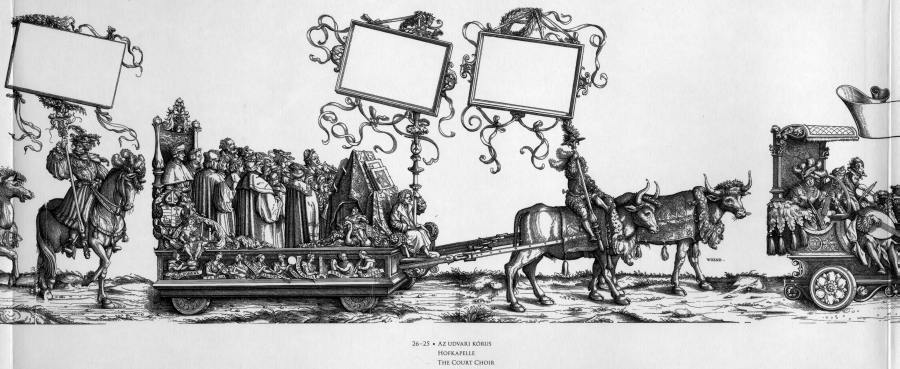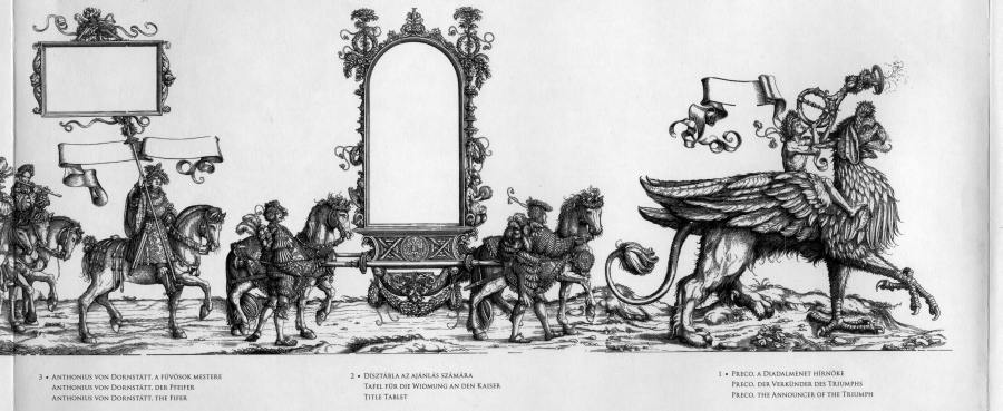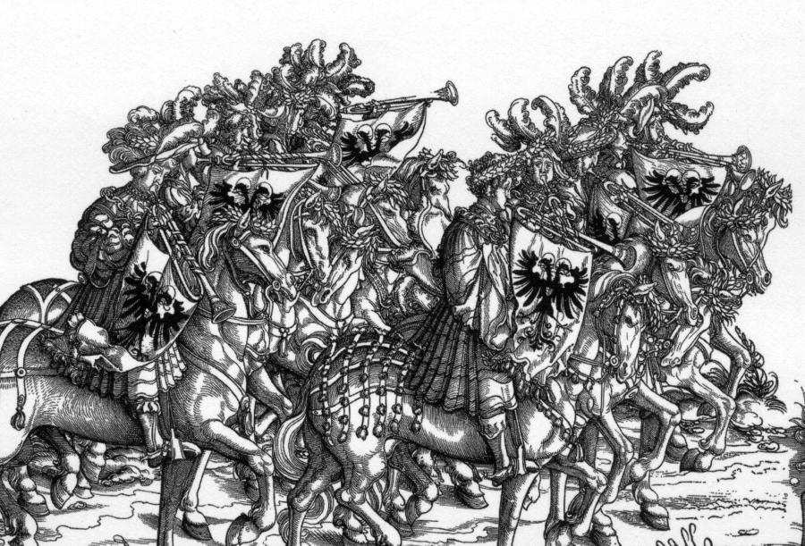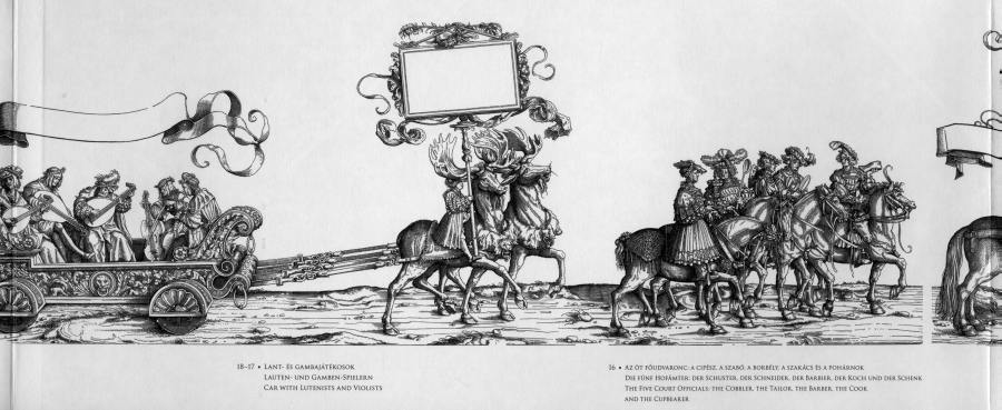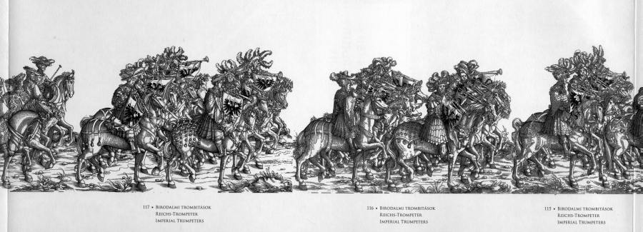 Что известно о "Триумфальной Процессии"? Она составляет с "Аркой Славы" цельный цикл, выполненный по единому заказу. Первоначальные рисунки для "Триумфальной Процессии" были сделаны Йоргом Колдерером (Jo"rg Ko"lderer), однако, оказывается, ВСЕ ОНИ УТЕРЯНЫ. Затем, якобы между 1514 и 1516 годами, Альбрехт Альтдорфер (Albrecht Altdorfer) нарисовал 109 больших рисунков тушью, раскрашенных акварелью. Их уцелело лишь 62. Потом началась работа по созданию рисунков для гравюр на дереве: 67 листов сделал Ганс Буркгмайер (Hans Burgkmair), 39 листов - Альбрехт Альтдорфер, а также работали Ганс Шпрингинкли (Hans Springinklee), Альбрехт Дюрер (Albrecht Du"rer), Леонард Бекк (Leonhard Beck) и Ганс Шауфелейн (Hans Scha"ufelein).
