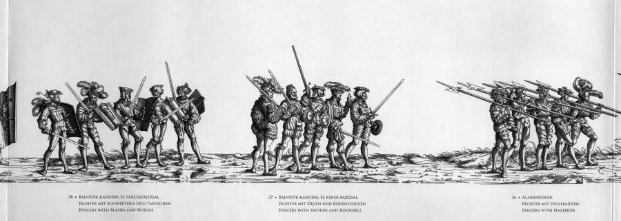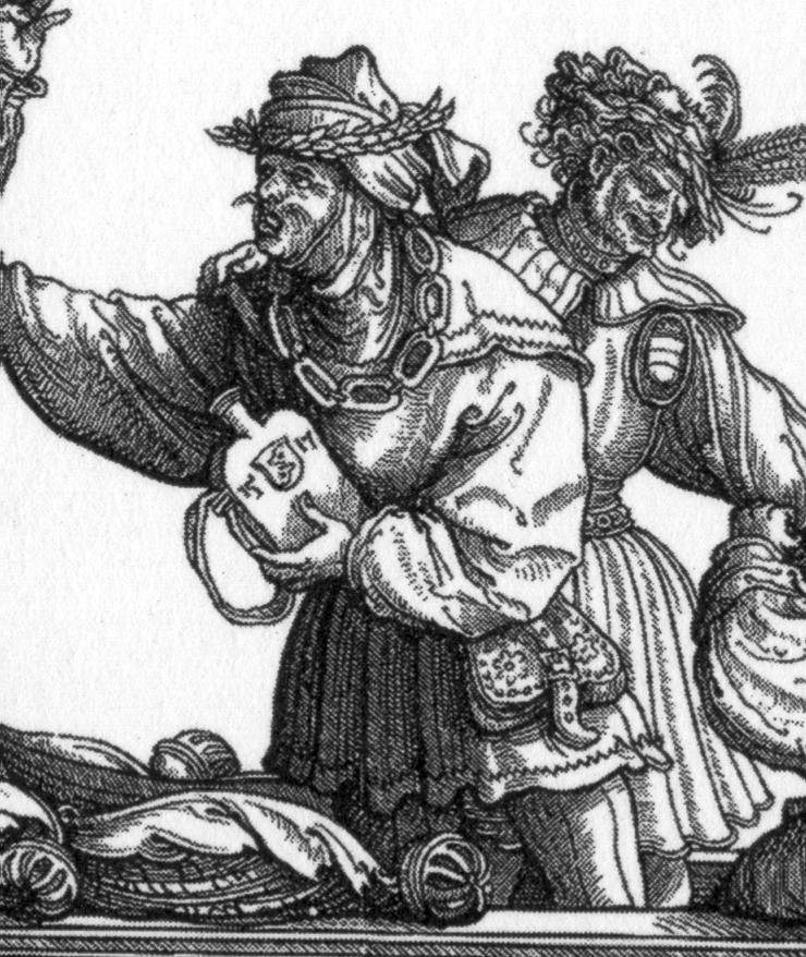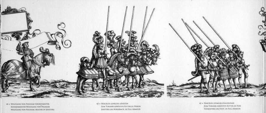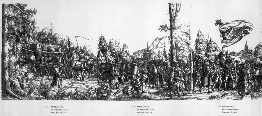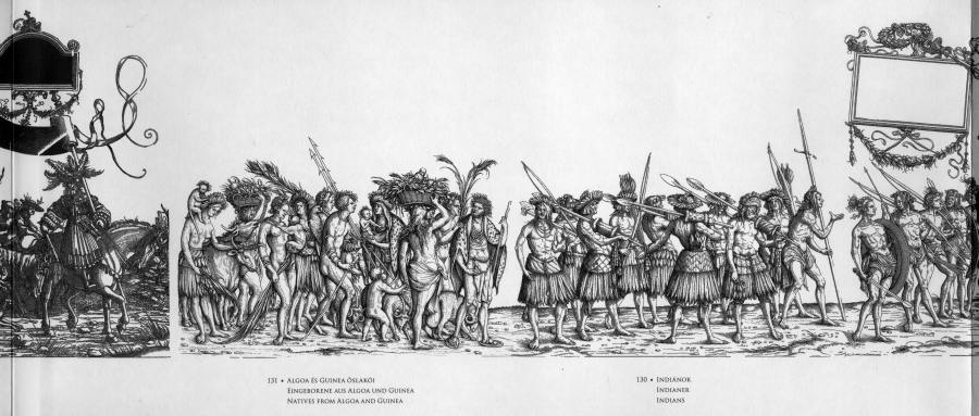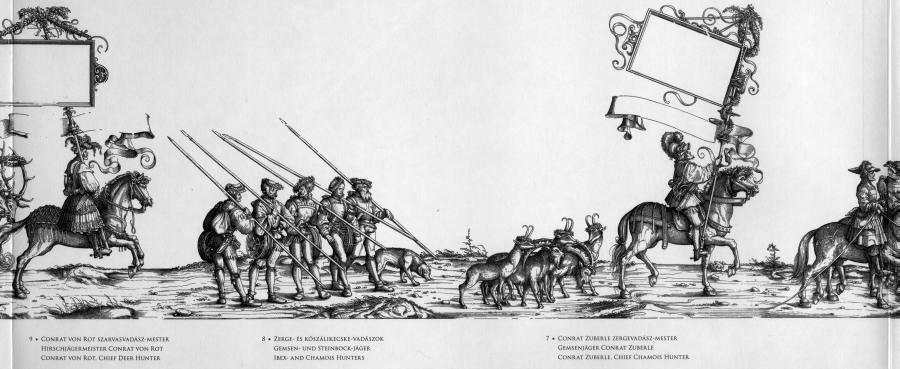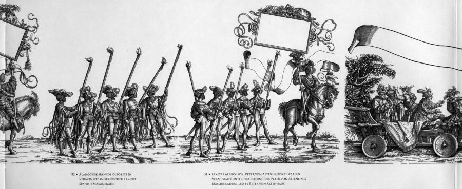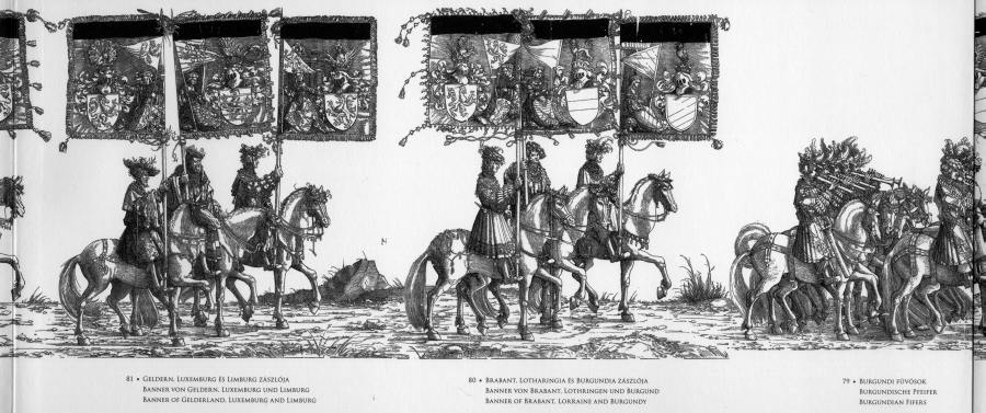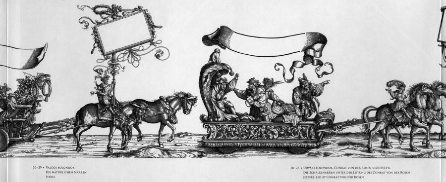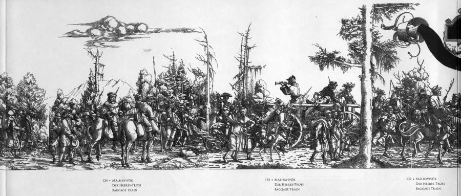 Что известно о "Триумфальной Процессии"? Она составляет с "Аркой Славы" цельный цикл, выполненный по единому заказу. Первоначальные рисунки для "Триумфальной Процессии" были сделаны Йоргом Колдерером (Jo"rg Ko"lderer), однако, оказывается, ВСЕ ОНИ УТЕРЯНЫ. Затем, якобы между 1514 и 1516 годами, Альбрехт Альтдорфер (Albrecht Altdorfer) нарисовал 109 больших рисунков тушью, раскрашенных акварелью. Их уцелело лишь 62. Потом началась работа по созданию рисунков для гравюр на дереве: 67 листов сделал Ганс Буркгмайер (Hans Burgkmair), 39 листов - Альбрехт Альтдорфер, а также работали Ганс Шпрингинкли (Hans Springinklee), Альбрехт Дюрер (Albrecht Du"rer), Леонард Бекк (Leonhard Beck) и Ганс Шауфелейн (Hans Scha"ufelein).