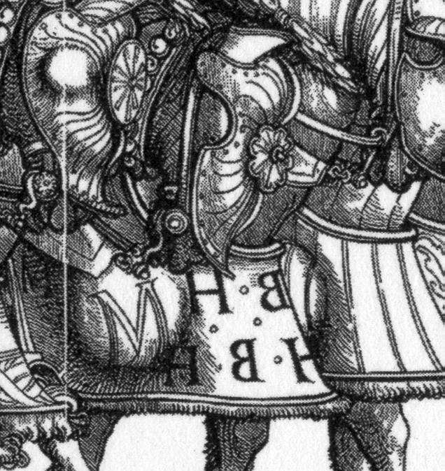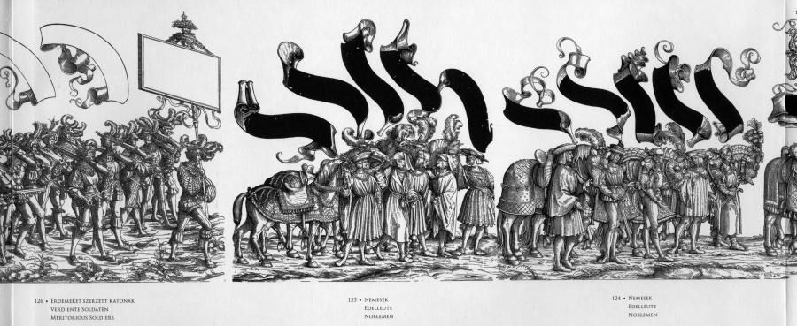 По-видимому, современные комментаторы правы, говоря, что в некоторый момент, якобы в связи со смертью Императора, работы над гигантской "Триумфальной Процессией" были прерваны. И более не возобновлялись. На это ясно указывают пустые, незаполненные картуши. Но при этом комментаторы уклончиво обходят другое и более яркое обстоятельство, предпочитая почему-то не обсуждать его вовсе. А именно, присутствие на "Триумфальной Процессии" СТА ЧЕТЫРЕХ (!) картушей, явно намеренно закрашенных черной краской. Эти черные пятна резко выделяются на общем фоне исключительно подробных и тщательно исполненных гравюр. "Черные кляксы" сразу бросаются в глаза. Хотя их закрашивали аккуратно, старались бережно обвести контуры картуша, дабы не запачкать соседние изображения, однако результат получился довольно грубый. Черные пятна "выпирают" из рисунка и сразу наводят на мысль, что тут хотели что-то скрыть.