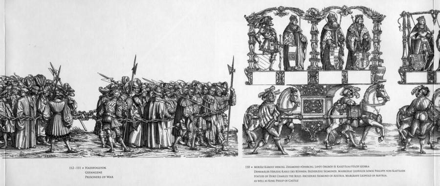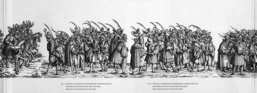 "Триумфальная Процессия" представляет собой длинную ленту, составленную из отдельных гравюр. В полном объеме все сохранившиеся сегодня гравюры были собраны и выставлены в августе 2005 года в Будапештском Музее Изящных Искусств (Fine Art Museum). А.Т.Фоменко и Т.Н.Фоменко удалось посетить эту интересную выставку. Длинная лента, составленная из гравюр, вытянулась вдоль стен большого зала, опоясывая его почти целиком. В "Триумфальной Процессии" участвуют сотни людей. Все они движутся в одном направлении, слева направо. Воины, знатные люди, царедворцы, пленники, аллегорические фигуры идут пешком, едут на колесницах, на конях, несут знамена и штандарты, копья, различное оружие. В процессии участвуют лошади, верблюды, фантастические животные. Перед нами - сложнейшая и кропотливая работа, потребовавшая от мастеров огромного труда и времени.