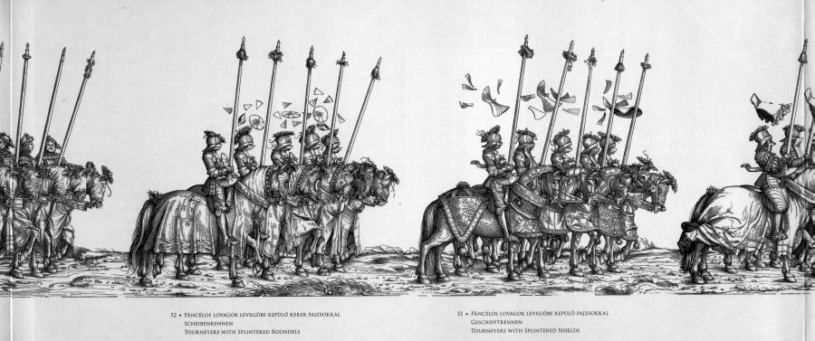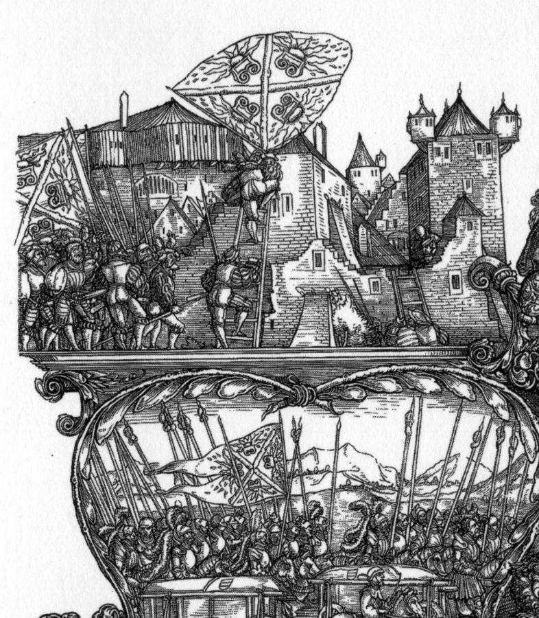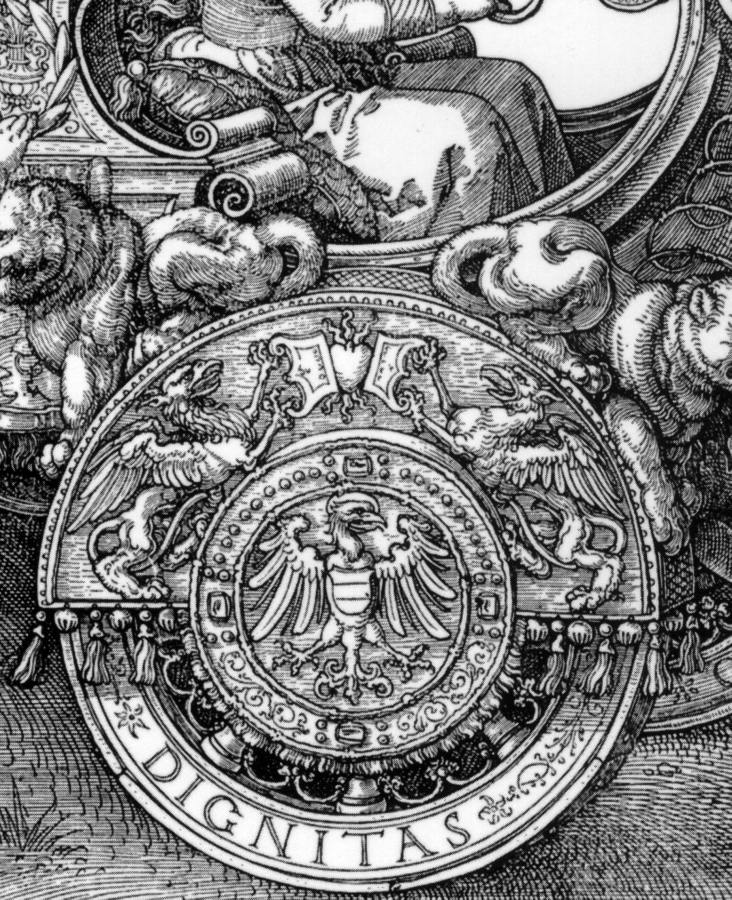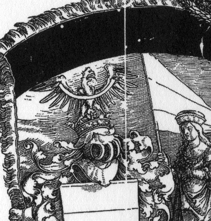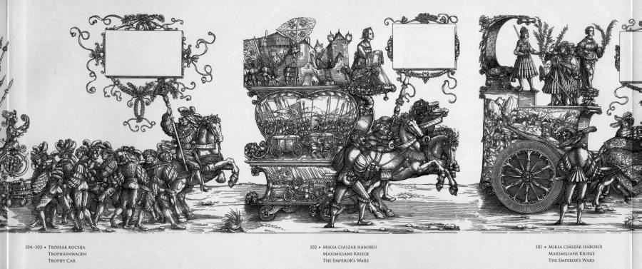 Правление императора Максимилиана I (1459-1519) считается золотым веком германского искусства эпохи Ренессанса. В честь Максимилиана I художник и гравер Альбрехт Дюрер создал якобы в XVI веке знаменитую "Арку Славы" [1067]. Мы подробно рассказали о ней и связанных с ней проблемах и странностях в книге "Реконструкция", гл.18:8. "Арка Славы" состояла из 190 гравюр, собранных затем в единое изображение на большом плоском щите размером примерно 3 на 4 метра. Гравюры были изготовлены на деревянных досках. Арка Славы была создана, как пишут историки, по образцу "древне"-римских триумфальных арок [1117], с.91. Но только те изготовлялись в камне, а дюреровская Арка была нарисована на бумаге.