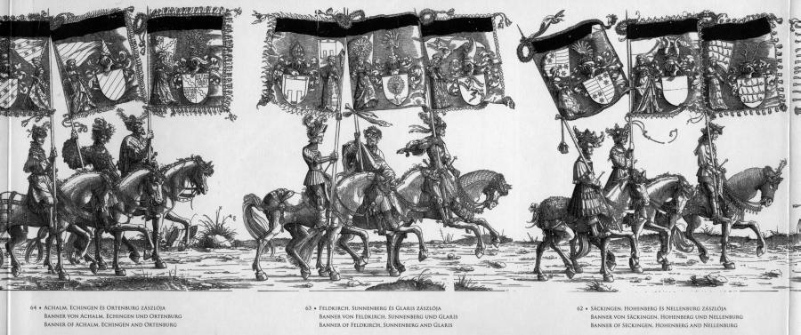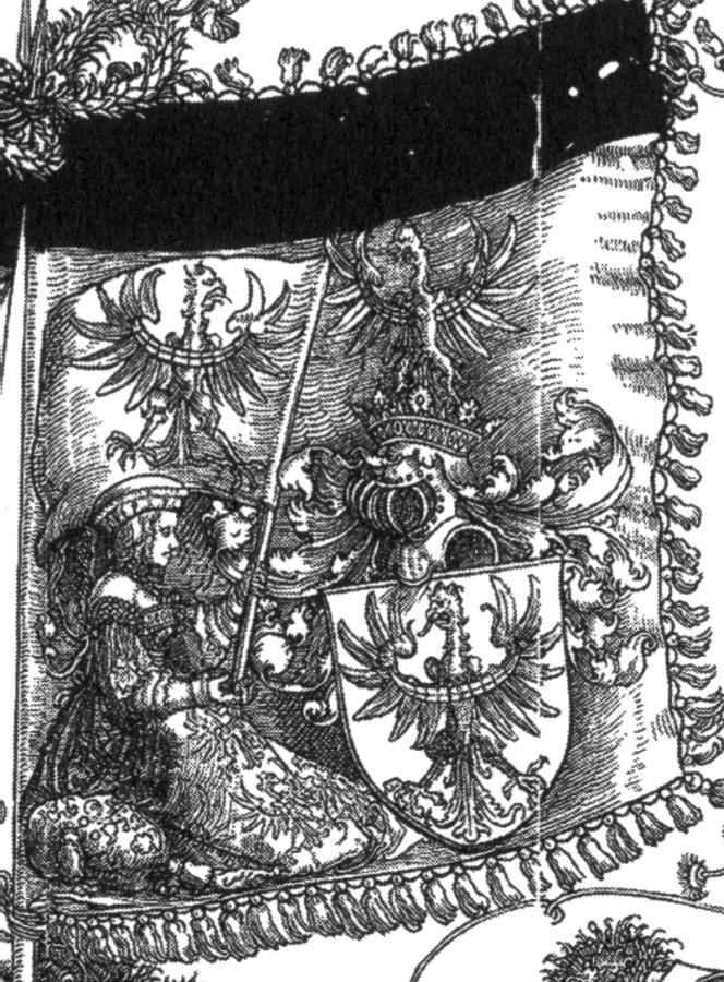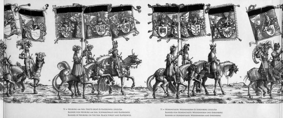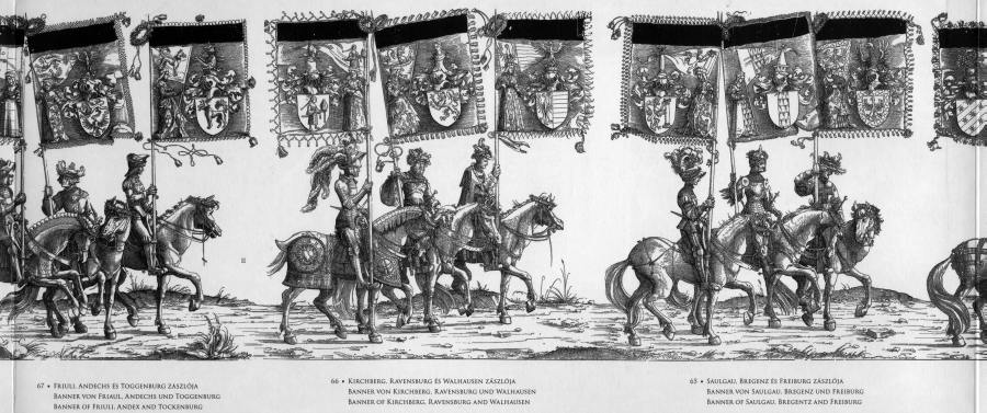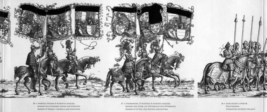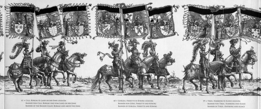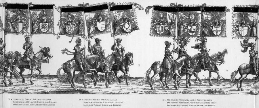 Когда якобы в 1519 году император Максимилиан умер, работы над "Триумфальной Процессией" были прерваны [1113:1], с.14-15. Именно этим обстоятельством сегодняшние комментаторы объясняют тот факт, что множество картушей, явно предназначенных для надписей, ОСТАЛИСЬ ПУСТЫМИ. Достаточно взглянуть на приведенные нами рисунки. Сразу видно, что вся "Триумфальная Процессия" буквально пестрит белыми, пустыми картушами и знаменами. Внутри них ничего не написано. Более того, надписей нет уже на самых первых картушах и знаменах, которыми открывается "Триумфальная Процессия", рис.p49. Скорее всего, тут должны были быть какие-то особо торжественные, главные надписи. Например, с полным титулом Императора, с указанием земель, которыми он владел.
