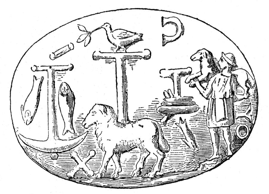 На гравюрах "Триуфальной Процессии" хорошо видны переходы друг в друга полумесяца со звездой и двуглавого или одноглавого орла с поднятыми крыльями, см., например, рис.p59, рис.p60, рис.p61, рис.p62. Интересный символ мы видим на конской попоне на рис.p63. Перед нами - все тот же полумесяц со звездой=крестом, но изображенный в виде, напоминающем морской якорь. Позднее первоначальное родство символики было забыто, и комментаторы стали рассуждать, что, дескать, якорь означает... далее обычно следуют туманные надуманные рассуждения. На рис.p64 показана "античная" камея с древне-христианскими изображениями креста, рыбы и доброго пастыря. Слева мы вновь видим полумесяц со звездой=крестом в виде якоря.