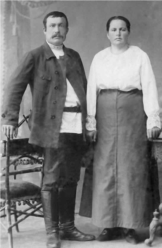 Мама часто вспоминала её. Она была высокая, очень красивая, стройная, с огромной толстой черной косой, которую в замужестве красиво укладывала вокруг головы. На этом снимке ей всего 16 лет. Ещё девушкой Дуняше приходилось много работать. Она хорошо умела шить, делала очень красивые искусственные цветы и продавала их, тем поддерживая свою семью. Отец её выпивал, и жили они бедно. К своей свадьбе Дуняша сама сшила себе очень красивое свадебное платье и сделала очень красивые искусственные цветы. Букетик этих цветов приколола к платью, а из остальных сделала веночек над фатой. Всё это хорошо видно на сохранившейся фотографии (см. свадебное фото дедушки и бабушки выше, фрагмент которого помещён на этой странице). Сохранилась фотография её родителей, моих прадедушки и прабабушки и фото Анны, двоюродной сестры Евдокии Михайловны. Помещаю их ниже.