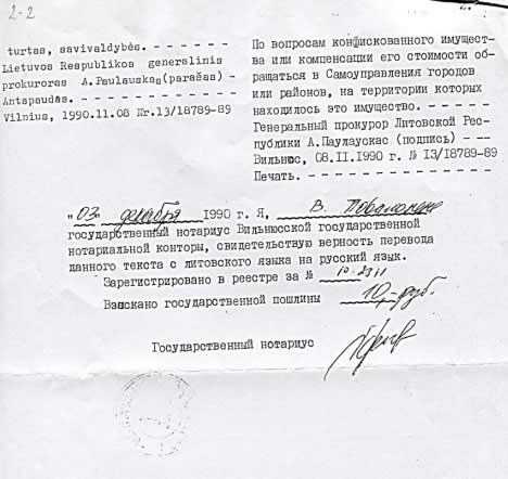 2. Письмо прокурора Генеральной прокуратуры Литовской Республики №13/18789-89 от 08.11.1990 Иваний Г.А. об отправке справки о её незаконном нахождении в заключении и справка о восстановлении всех прав Бардзилаускайте Г.А., на литовском и русском языках.