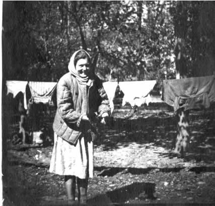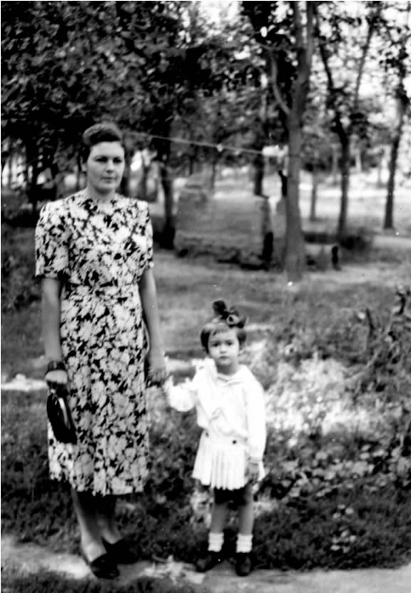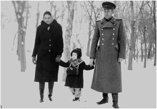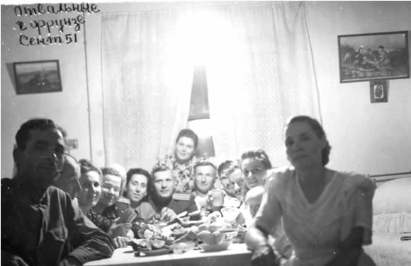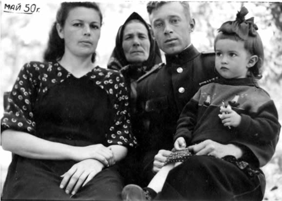 Дом наш был недалеко от ж/д вокзала (в 3 км от него), потом мимо него проложили проспект Мира. Когда мы приезжали во Фрунзе в 1965 году, он ещё стоял. Вот там у моих родителей и началась их семейная жизнь, и появилась на свет я в 1948 году 12 апреля. Ближайшими соседями были супруги евреи Гиль Фёдорович и Фанни Абрамовна - фамилии их я, к сожалению, не помню. Гиль Фёдорович был очень квалифицированный портной. Он шил на заказ, самые сложные фасоны. Мама уже тогда хоро-шо умела шить, научившись от своей матери. Гиль Фёдорович помогал ей советами. Под его руководством мама шила не только платья себе и мне, но даже сшила шикарный белый парадный китель из чесучи (это натуральный шёлк специальной выделки) для папы. Она вспоминала, что прокалывала дырочки для петель на нём с помощью верблюжьей колючки вместо шила. Мама шила всегда очень аккуратно и красиво. Кроме того, она превратила двор вокруг нашей «десятиквартирки» буквально в цветущий сад. Она насадила множество цветов: вьюнчик-апомею, георгины, ромашки садовые и многое др. И потом всю жизнь мама всегда украшала и дом, и двор, где приходилось жить, цветами. Она очень любила цветы.