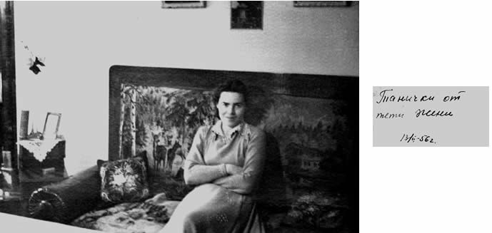 Сейчас она живёт в г.Краснодаре, в той квартире, в которой провела свои последние годы тётя Женя. Зоя Григорьевна - очень хороший, добрый и разумный человек. Тёти Жени не стало в 2000 году 20 сентября. Мама очень горевала, узнав о её смерти. Тётя Женя после нашего отъезда из Фрунзе много лет писала не только письма маме, но иногда и персонально мне присылала открытки к праздникам, однажды прислала мне на память своё фото. Это было в 1956 году, когда я училась в первом классе. Привожу это памятное фото ниже.