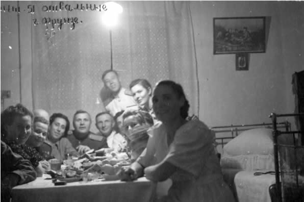 Мои родители зарегистрировали брак 07 мая 1947 года, а свадьба была 9 мая, в день Победы, в воскресенье. Свадебных фотографий у них не было, так как не было фотоаппарата. Папа купил его позже, уже когда я родилась в 1948 году. Это фото родителей (ниже) сделано в Новый 1950-й год, в компании у друзей.