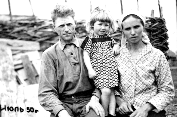 Папина двоюродная сестра Нюра (Анна) с мужем Григорием и дочкой Лидой. Июль 1950 г., с. Арзамасцевка.