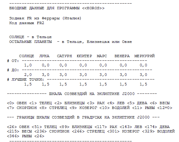 Приведем соответствующие входные данные для вычислительной программы ХОРОС. Положения планет задаются в нижеприведенных таблицах по "шкале созвездий", введенной нами в [НХЕ], гл.5. Все границы расположения планет являются гибкими: в расчетах по программе ХОРОС допускается их нарушение на 5 градусов дуги, что практически исключает возможность потери правильного решения. Однако за это неизбежно приходится платить появлением некоторого количества лишних предварительных решений, не вполне удовлетворяющих гороскопу. Лишние решения отбрасываются вручную на этапе проверки и отсева предварительных решений.