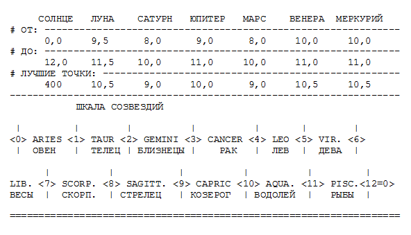 Приведем данные для программы ХОРОС, соответствующие данному гороскопу.