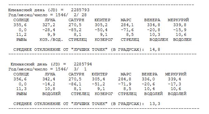 Приведем расчетные положения планет в зодиакальных созвездиях на полдень 28 февраля и полдень 1 марта 1546 года. Здесь в первой строке цифр под названием планеты стоит ее долгота на эклиптике J2000 в градусах дуги; во второй строке цифр - отклонение планеты от Солнца по эклиптикальной долготе в градусах дуги; в третьей строке - положение планеты по "шкале созвездий" [НХЕ]. Еще ниже для каждой планеты приведено название зодиакального созвездия, в котором она находилась. Далее приводится среднее отклонение планет по долготе от их "лучших точек". "Лучшие точки" заданы выше во входных данных для программы ХОРОС. В данном случае они определены для всех планет, кроме Солнца, положение которого в расчетах ничем не ограничивалось, см. выше. Под средним отклонением понимается среднее значение абсолютных величин отклонений по эклиптикальной долготе. См. также рис.4.33, рис.4.34, рис.4.35.