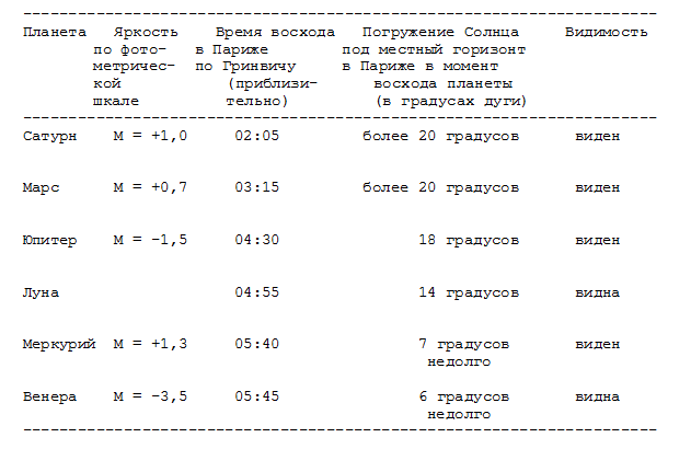Остальные пять планет, изображенные на зодиаке, были видны утром на предрассветном небе Парижа как 28 февраля, так и 1 марта 1546 года. Приведем время восхода, яркость и другие условия видимости всех шести планет для 28 февраля (расчет по программе Turbo-Sky). См. рис.4.36. На следующий день, 1 марта условия видимости всех планет, кроме Луны, практически не изменились, но Луна стала уже невидима.