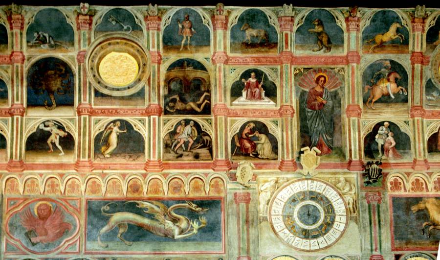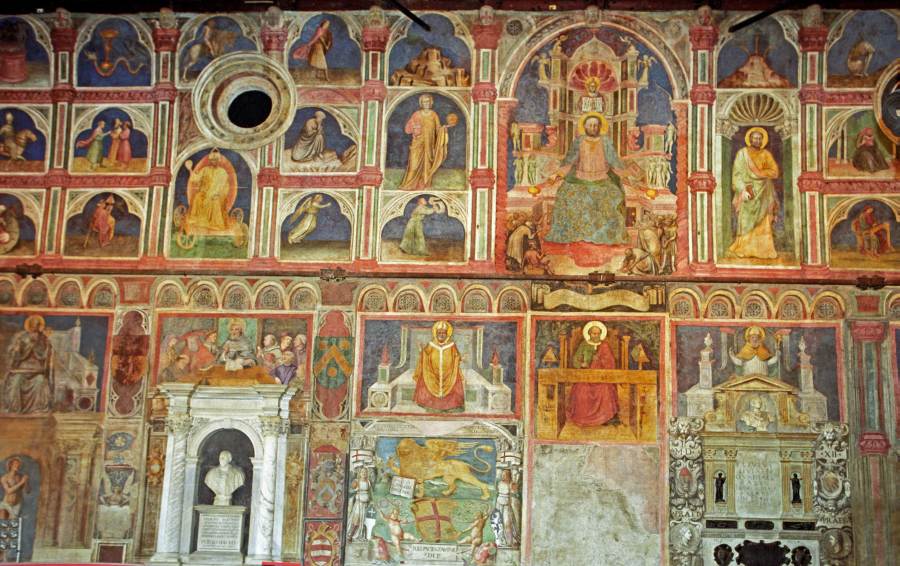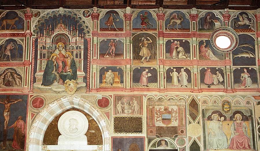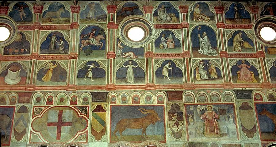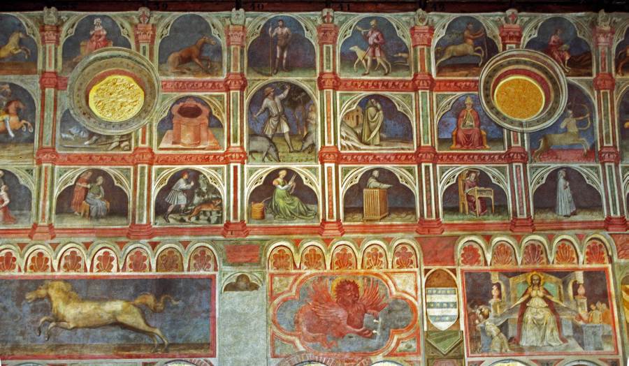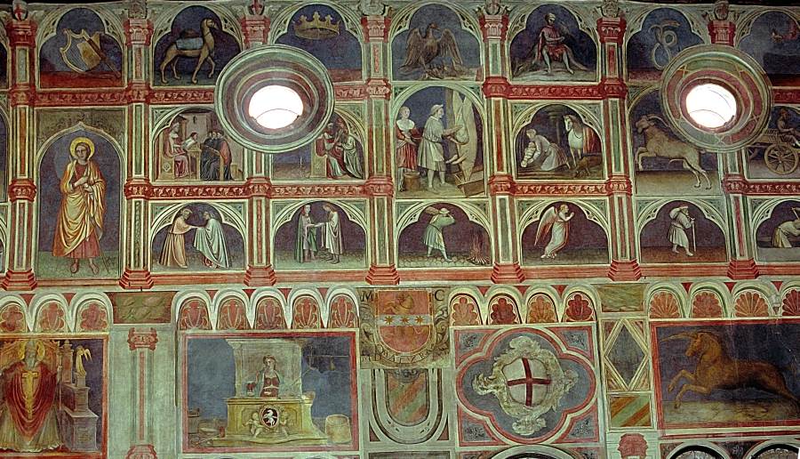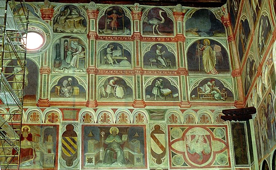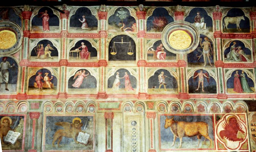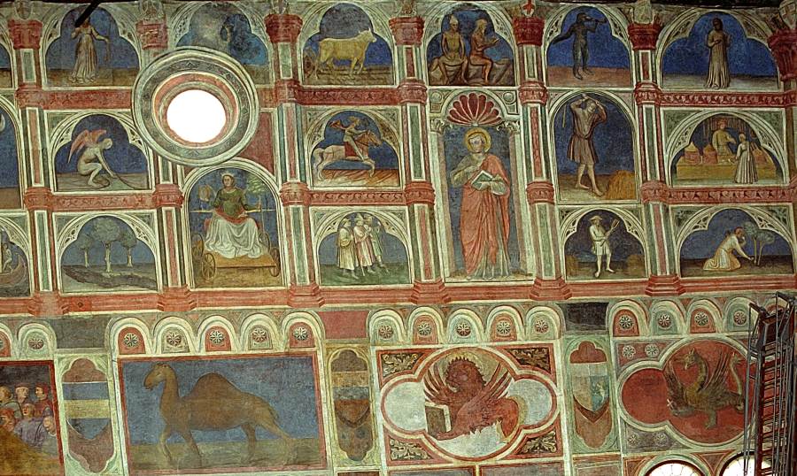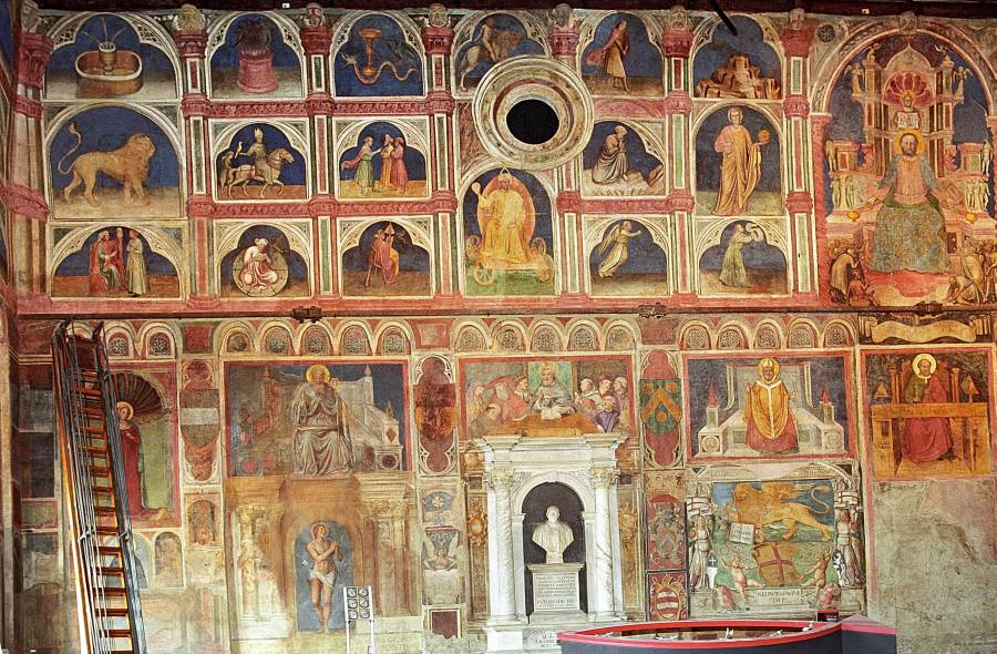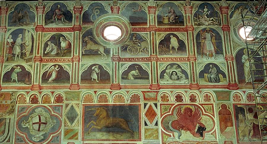 Запомним эту дату: вторая половина XVIII века. Именно тогда фрески Палаты Раджоне, как нам говорят, были "аккуратно восстановлены" и приобрели свой нынешний вид, Якобы совпадающий с фресками Николо Миретто и Стефана Феррарского середины XV века.