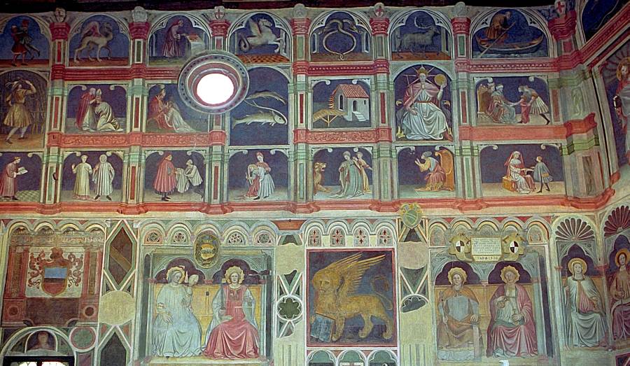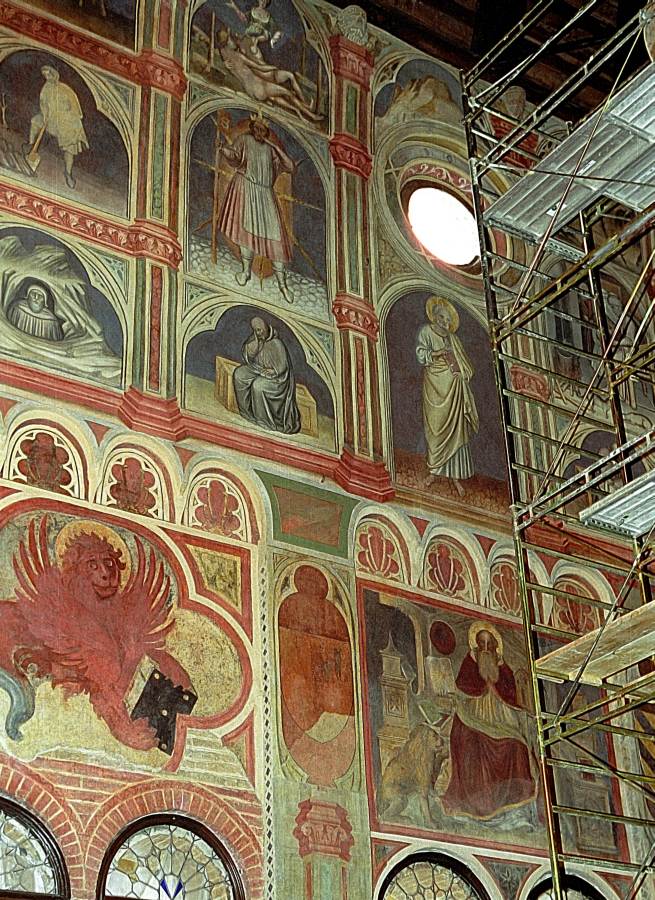 Но в 1420 году фрески Джотто, как сообщается, почти полностью погибли во время пожара [1324:1], с.90. Новые фрески на этом месте были созданы, по словам историков, падуанским мастером Николо Миретто (Nicolo Miretto) и феррарским художником, чье имя предположительно было Стефан (в данном случае историки все-таки сомневаются) [1007:1], с.46. Считается, что Николо Миретто и Стефан из Феррары приложили все силы, чтобы восстановить погибшие фрески Джотто в их первозданном виде, и им это более или менее удалось [1324:1], с.90.