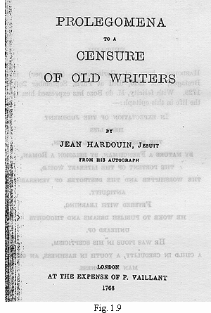 Un altro famoso esponente di questa tesi fu Jean Hardouin (1646 -1729), direttore della French Royal Library. La maggior parte della letteratura classica, diceva lui, era stata fabbricata nei secoli tredicesimo e quattordicesimo. Come possiamo leggere su wikipedia anche Hardouin, che era un un gesuita, fu studioso degli antichi testi classici e delle antiche monete, e scrisse i testi Chronologiae ex nummis antiquis restitutae (1696) e Prolegomena ad censuram veterum scriptorum, e si convinse che, con l'eccezione di pochi testi, i classici testi dell'antichità greco-romana fossero dei falsi fabbricati da monaci del 13° secolo, e lo stesso egli affermava riguardo a molti capolavori artistici, monete, iscrizioni. Affermò anche che molti antichi avvenimenti fossero stati inventati di sana pianta, in particolare tutti i concili avvenuti prima di quello di Trento.