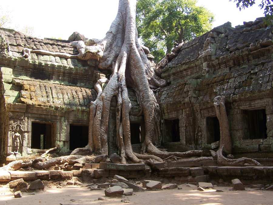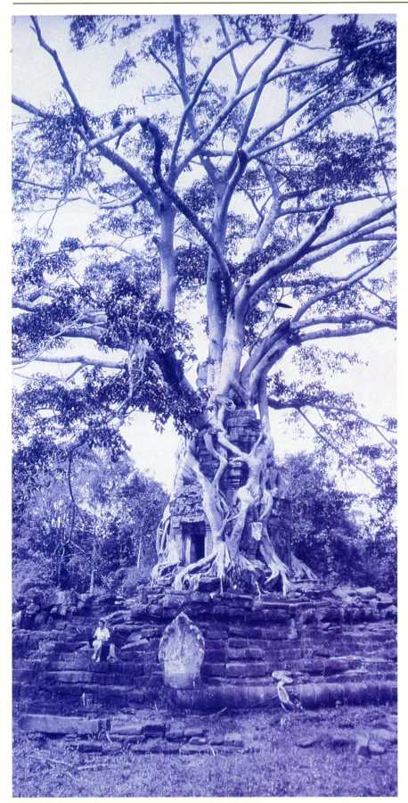На рис.1.30, рис.1.31 и рис.1.31a приведены фотографии XX века, показывающая - насколько активно южная растительность покрывает и опутывает заброшенные храмы (Камбоджа, Таиланд). На рис.1.30 - башня камбоджийского храма Неак Пхеан, тесно обхваченная стволами дерева баньян. В 1935 году ураган обрушил дерево и башню вместе с ним. На рис.1.31 - дерево, заполнившее храм Та Пром. А нас уверяют, что многочисленные храмы Камбоджи, например, в городе Ангкор, созданы около 800-900 лет тому назад и долгое время находились в забвении, покинутые жителями. Скорее всего, города возведены в эпоху XIV-XVI веков, а покинуты после раскола Великой = "Монгольской" Империи в XVII веке. Взято из [99:0], с.97.