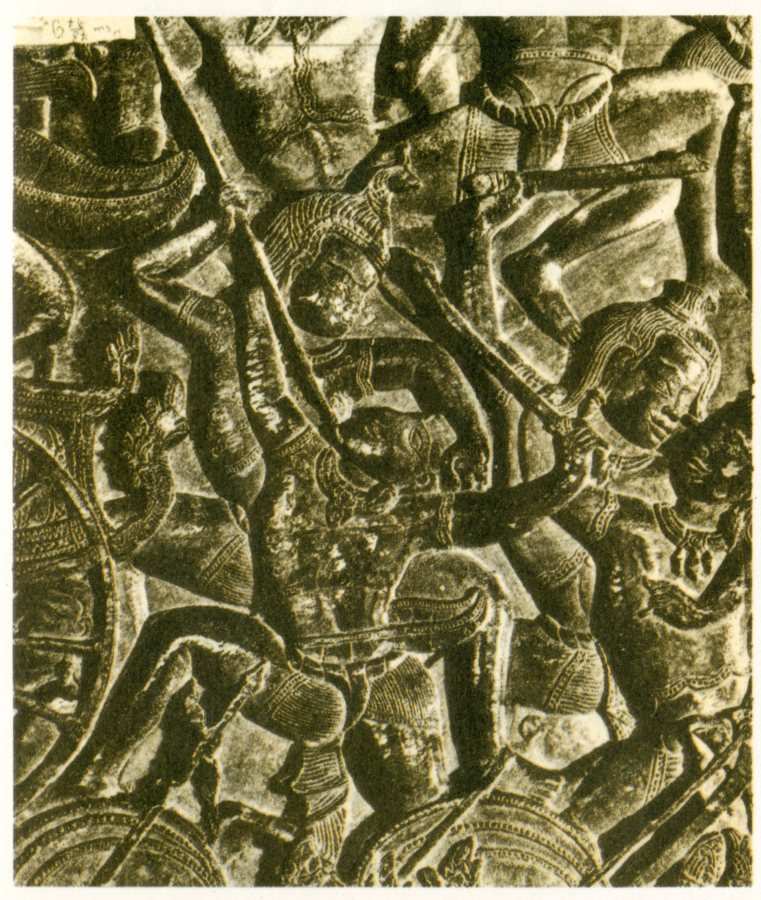 Но тогда сразу приходит мысль, что санскритское название Курук-Шетра произошло от славянского Кулук-Жертва или Кулак-Жертва, то есть на поле КУЛАК было много ЖЕРТВ, полегло много воинов. Название "Куликово", как мы отмечали в книге "Новая хронология Руси", гл.6, могло произойти от слова КУЛАК, биться "на кулачках" и т.п. На рис.1.32 и рис.1.33 мы приводим фрагменты старинных каменных барельефов якобы XII века из Ангкор-Вата, в Камбодже, изображающие битву на поле Курукшетра. На рис.1.34 показан один из храмов города Ангкор в Камбодже.