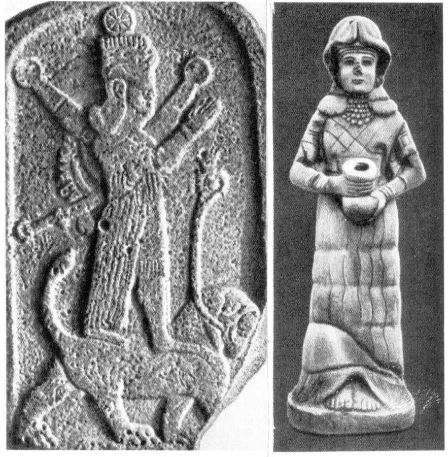 Рис.1.97. "Слева - Богиня Иштар на льве, ее символическом звере. Рельеф из Эшнунны. Париж. Лувр. Справа - статуя богини из храма в Мари. Начало 2 тыс. до н.э. Халеб. Национальный музей" [533], т.1, с.595. Скорее всего, перед нами - изображения Елены Волошанки = Елены Глинской, то есть царицы XVI века, правившей в Руси-Орде. Историки ошиблись здесь в датировке примерно на три с половиной тысячи лет.