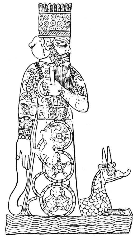 Рис.1.99. Вавилонский бог Мардук, относимый историками к III тысячелетию до н.э. На самом деле, это изображение господаря Стефана, или Дмитрия - сына Елены Волошанки, живших в XVI веке. В XVII-XVIII веках их литературные образы значительно удалились от оригиналов, стали восприниматься как нечто "очень древнее" и сказочное. В таком духе они изображались в областях "Монгольской" Империи, удаленных от метрополии. Взято из [59:1], с.162.