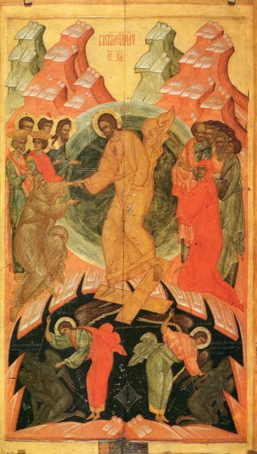 Когда же говорили между собою Сатана и главный мучитель, раздался голос, грому подобный, и множества духов клич: "Уберите врата царей ваших и воздвигните врата вечные, и войдет Царь славы!"... Увидев это, Ад и служители его бесчестные задрожали в собственных царствах своих, познав столь великого Света сияние. Когда же увидели Господа сидящим на престоле, то возопили: "Отныне мы побеждены Тобой! ... Всех у нас хочешь отнять. Наверное, Ты и есть тот Иисус, Сын Божий, о котором старейший наш диавол поведал, что благодаря Своей смерти крестной все человечество Ты властию (Своею) выведешь от нас?" И тотчас Царь славы, крепкий Господь силою Своей попрал смерть и схватив диавола, связал (его), предал его муке вечной и увлек земного нашего отца Адама, и пророков, и всех святых, сущих (в аду), в Свое пресветлое сияние>> [29], с.93-97.