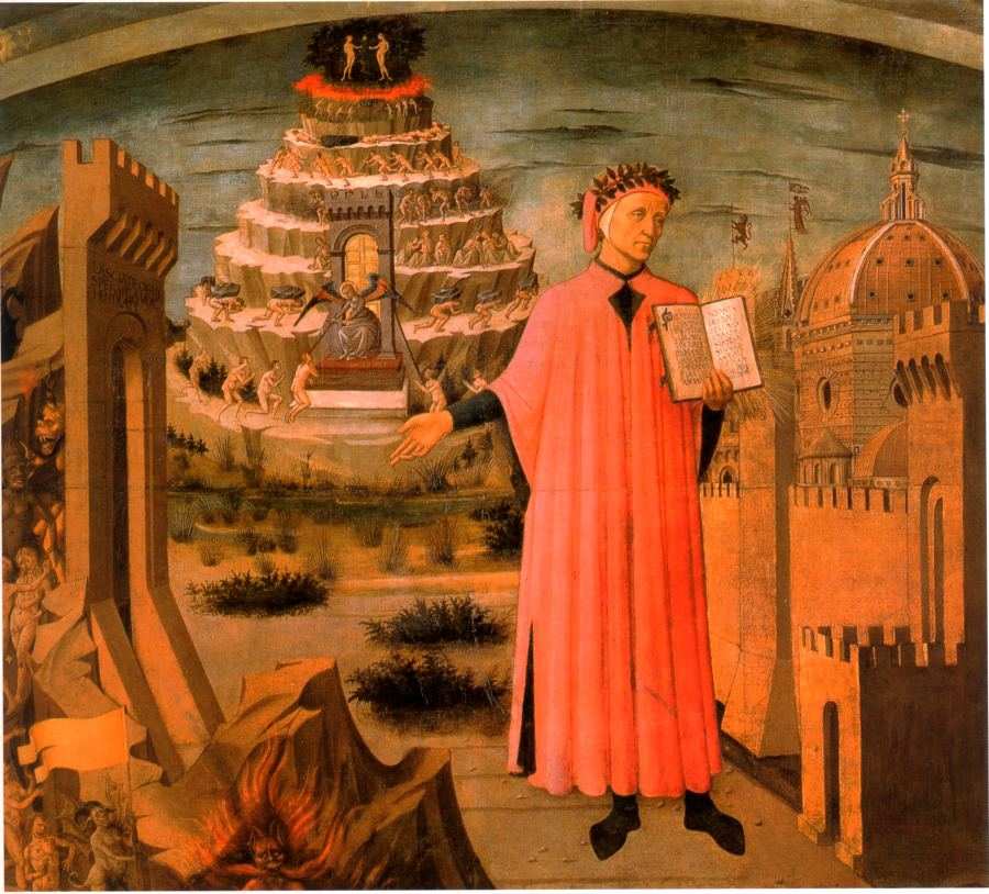 Рис.1.139a. Данте Алигьери представляет свою книгу "Божественная Комедия". Слева - спуск в Ад. Вверху на заднем плане - гора Чистилища и Рай. Это - три части поэмы Данте. Справа - город Флоренция. Фрагмент фрески во флорентийском соборе Санта-Мария дель Фьоре. Якобы 1465 год. Подробности см. в нашей книге "Божественная Комедия накануне конца света", где мы показываем, что на самом деле Данте жил не ранее конца XV века. Взято из [643:2], с.223, илл.4.