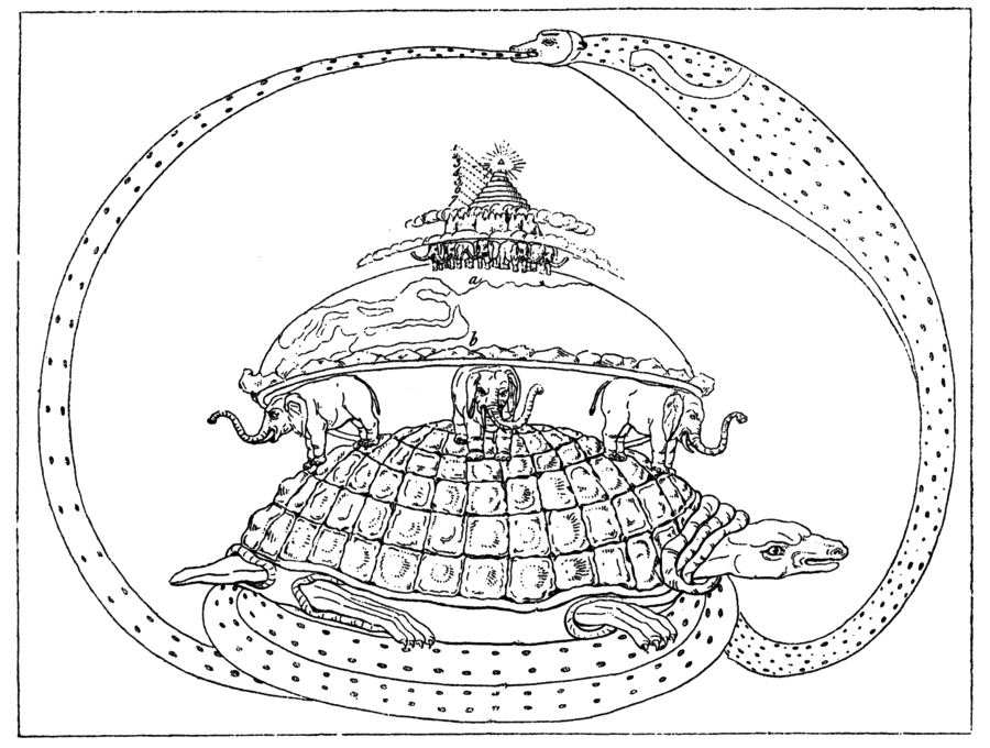 Первичные представления "древних" индийцев о строении Вселенной, начинались с идеи "плоской Земли", рис.1.143. То же самое мы наблюдаем и в истории средневековой Европы. Однако затем знания индийцев-арьев об окружающем мире развивались довольно быстро. Между прочим, на приведенном рисунке Земля изображена уже в виде полусферы, а вовсе не как "плоский блин".