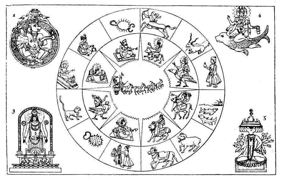 В Махабхарате есть также много астрологических мест, см., например, комментарии в [519], т.4, с.595-597, 600-601. На рис.1.144 приведен старинный индийский зодиак (вероятно, без гороскопа - то есть без записанной даты). В целом, он чрезвычайно похож на европейские зодиаки, хотя, конечно, есть отличия. Сказалось влияние иных традиций, сложившихся на полуострове Индостан.