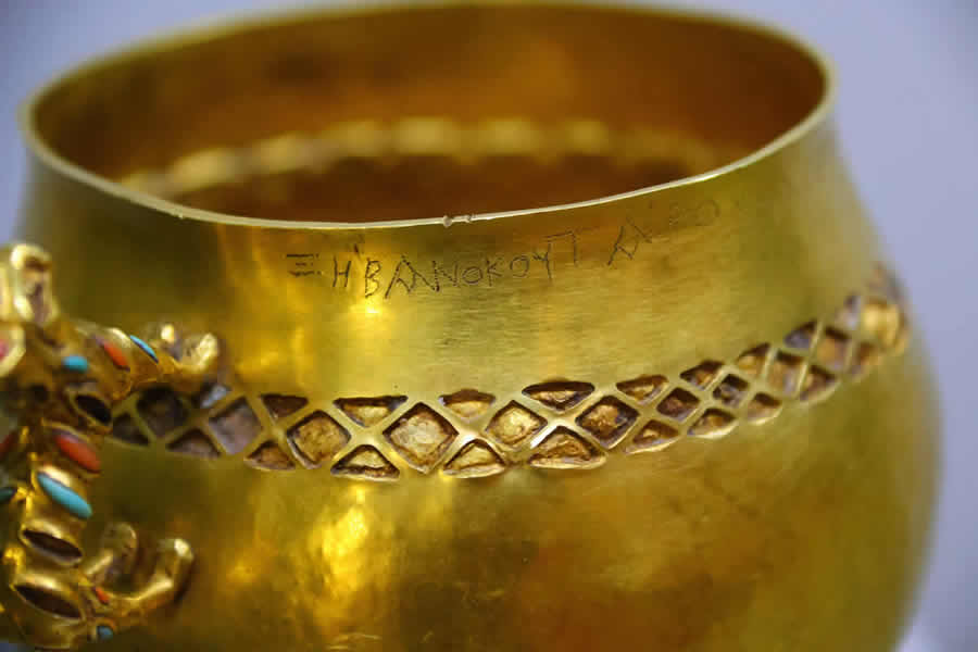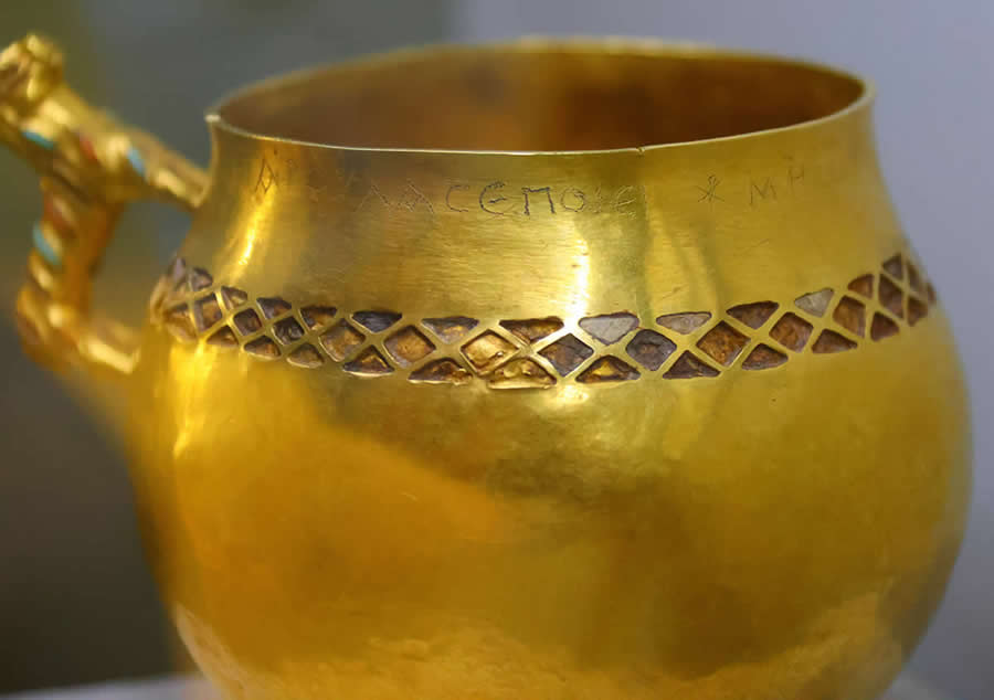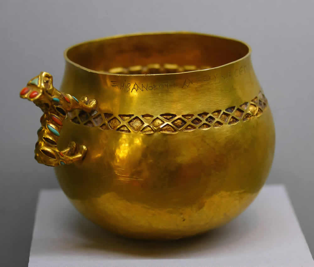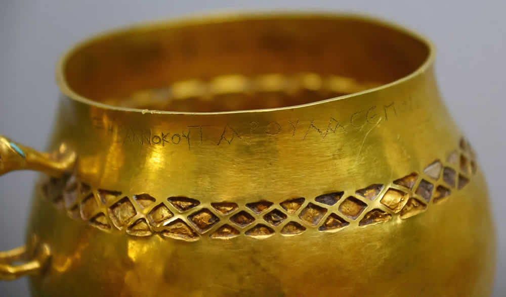 В частности, во время его раскопок было найдено большое количество золотых предметов. С двумя-тремя из них нам и удалось по счастливой случайности столкнуться на московской выставке. Кстати, это лишь малая часть золотых предметов коллекции графа А.С.Уварова, до сих пор томящихся в запасниках Государственного Исторического Музея. Как нам далее сообщила научный консультант выставки, сотрудница ГИМ, таких предметов у них много. Но они не выставляются. В данном случае произошло исключение из правил: в дополнение к санкт-петербургским и уфимским предметам нужно было подобрать что-то золотое "в зверином стиле" из собственных запасников. Эти кружки и попались под руку. Вероятно, из-за своих "звериных" ручек. Надпись на одной из кружек, по-видимому, просто не обратила на себя внимания организаторов выставки. Или показалась им "очевидно греческой". То есть вполне безобидной. Очень-очень античной. И в самом деле, отчего бы древним скифам не написать на своей кружке что-нибудь по-гречески. Выказать свою образованность. Они же, как считается, общались с "древними" греками. Поэтому могли перенять у них "высокий, благородный штиль". Писать скифы вообще-то не умели, согласно скалигеровской истории. Ни по-гречески, ни по-скифски. Поэтому, как нас уверяют, мы не должны удивляться тому, что на скифском золоте надписей, как правило, "не бывает".